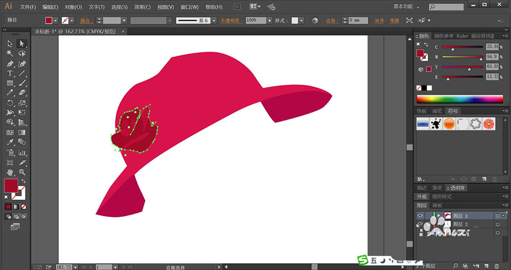 3、帽子左侧的花朵使用暗红色与红灰色搭配填充,让每一片的花瓣的红色调有所不同。
