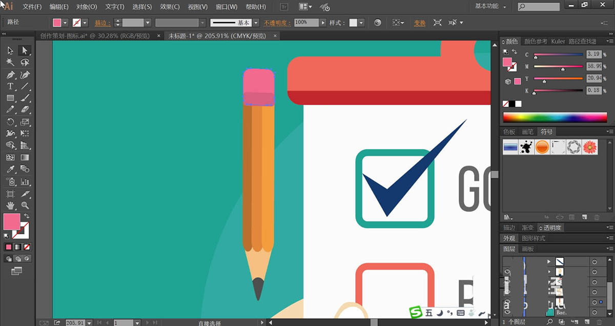 6、最后,我们适合矩形画出左侧的铅笔的路径,我们使用红灰色填充铅笔顶端的橡皮,再用黄褐色填充中间的笔身,使用黄灰色与灰黑色搭配填充铅笔头与笔尖的路径。