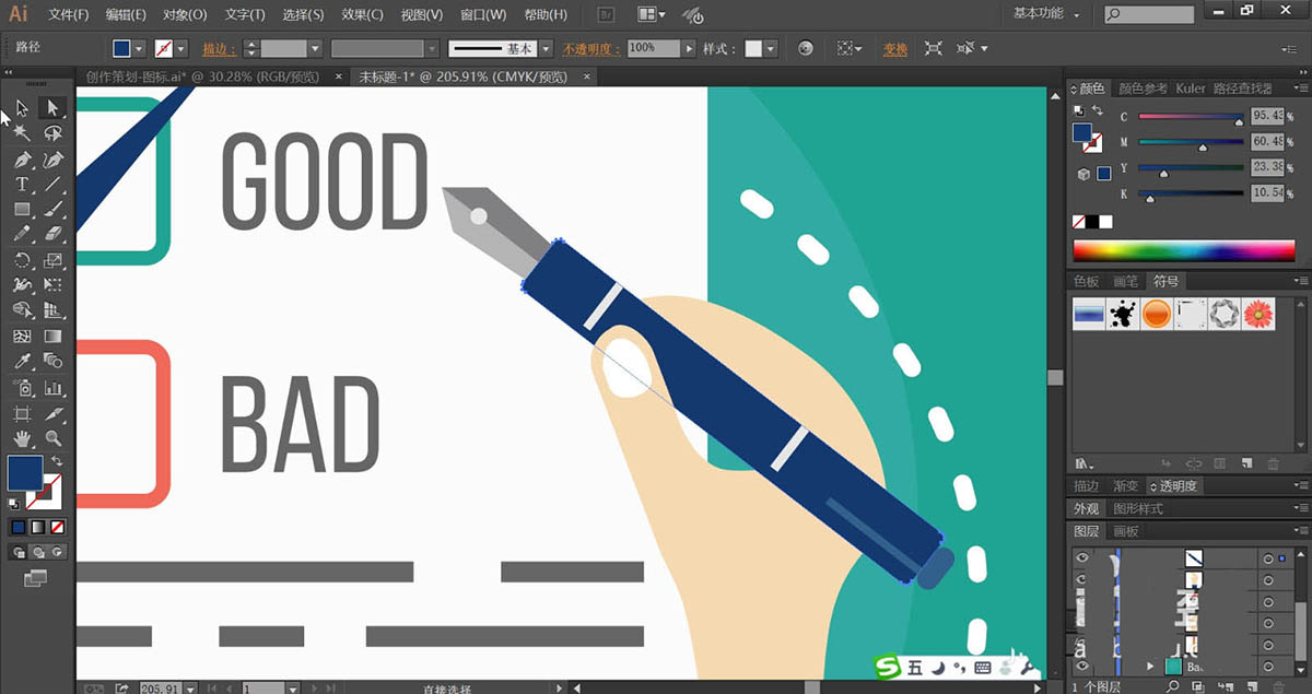 7、再画出右侧的钢笔路径,使用深蓝色填充钢笔主体路径,使用明暗灰色填充钢笔头的路径,再用白色与蓝灰色填充钢笔中间与末端的结构件,完成评测图片设计。
