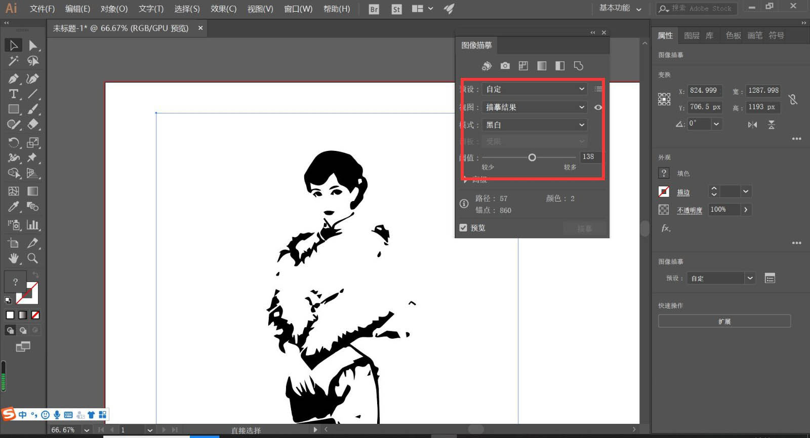 2、点击顶部导航栏——窗口——图像临摹(根据实际图片调整阈值大小)