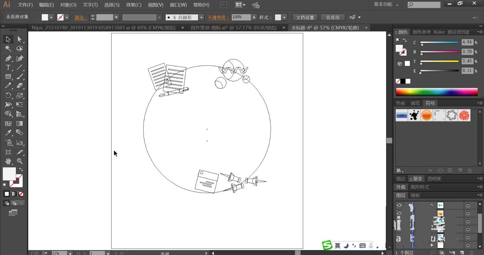 5、使用蓝黄色搭配填充圆形与上方的网络文字路径,下方的便签纸使用黄灰色与橙色、黄褐色填充不同的细节路径。