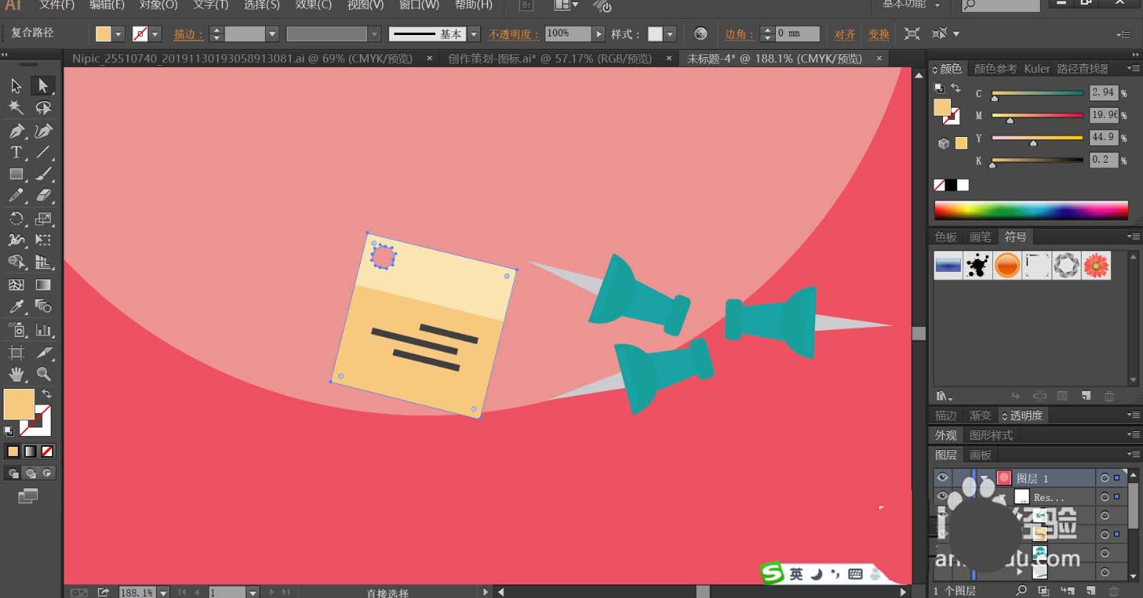 4、使用海棠红与红灰色搭配填充背景所在的矩形与中心的圆形路径,再用蓝色与灰白色填充墙钉的尖端与手柄的结构路径。