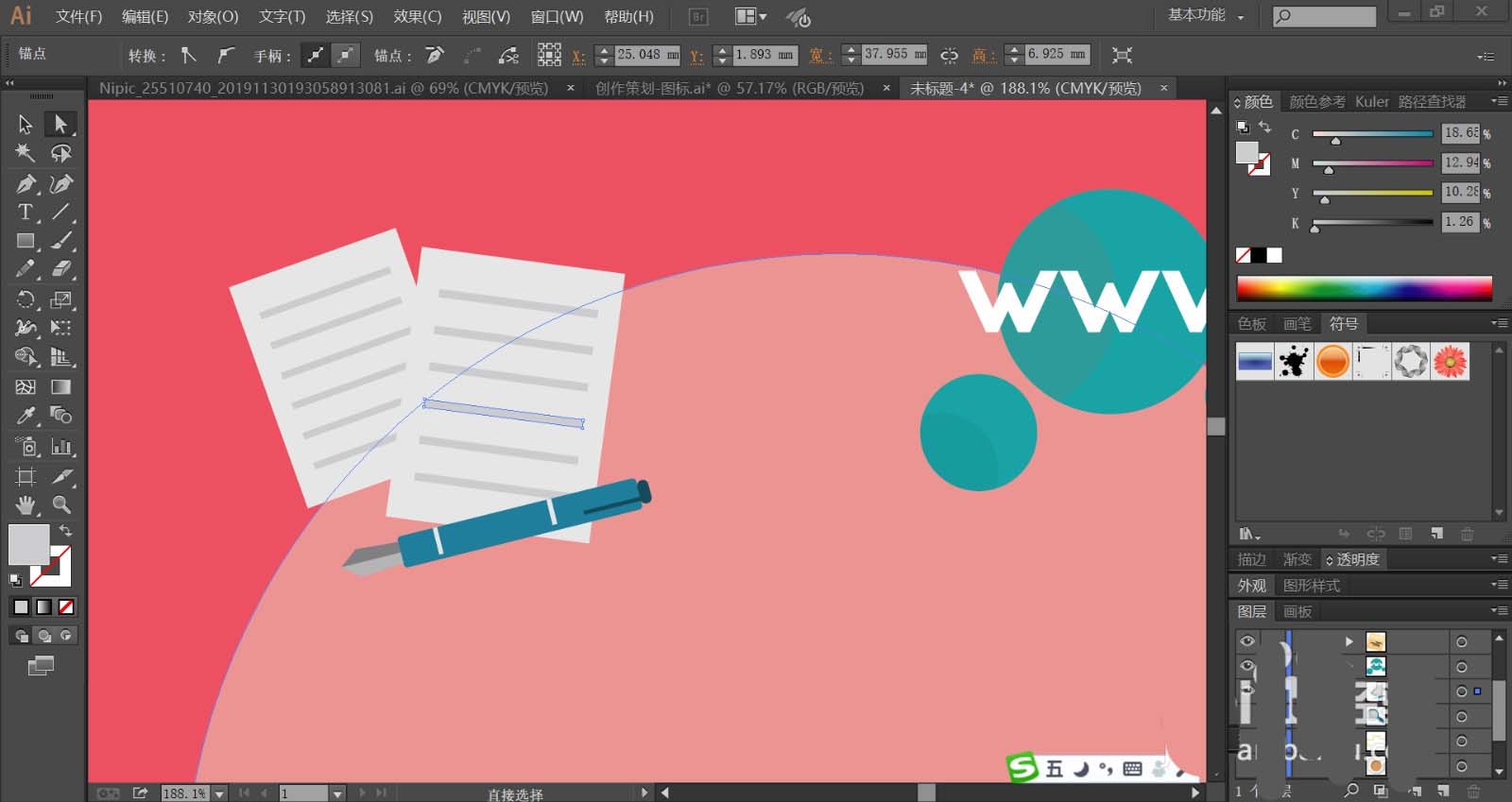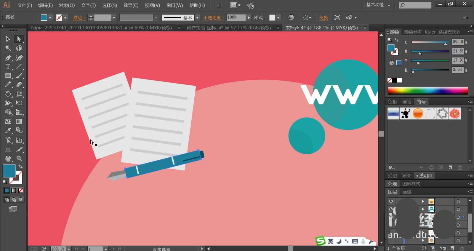 6、纸张使用灰白色填充,文字横线使用灰色填充,钢笔使用蓝色与灰黑色、天蓝色搭配填充不同的结构件。