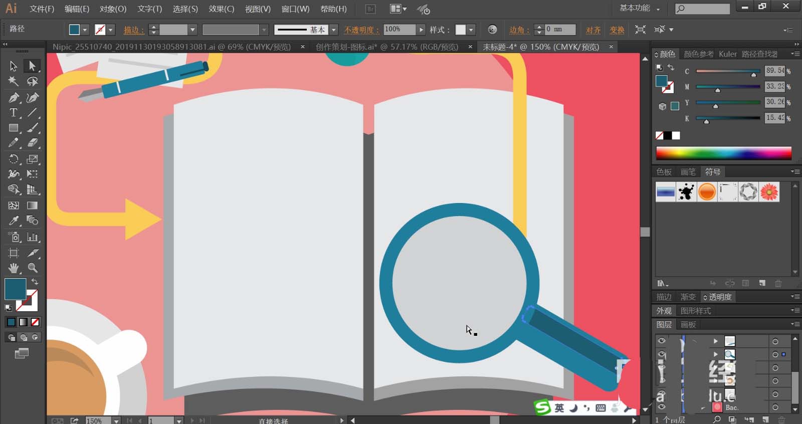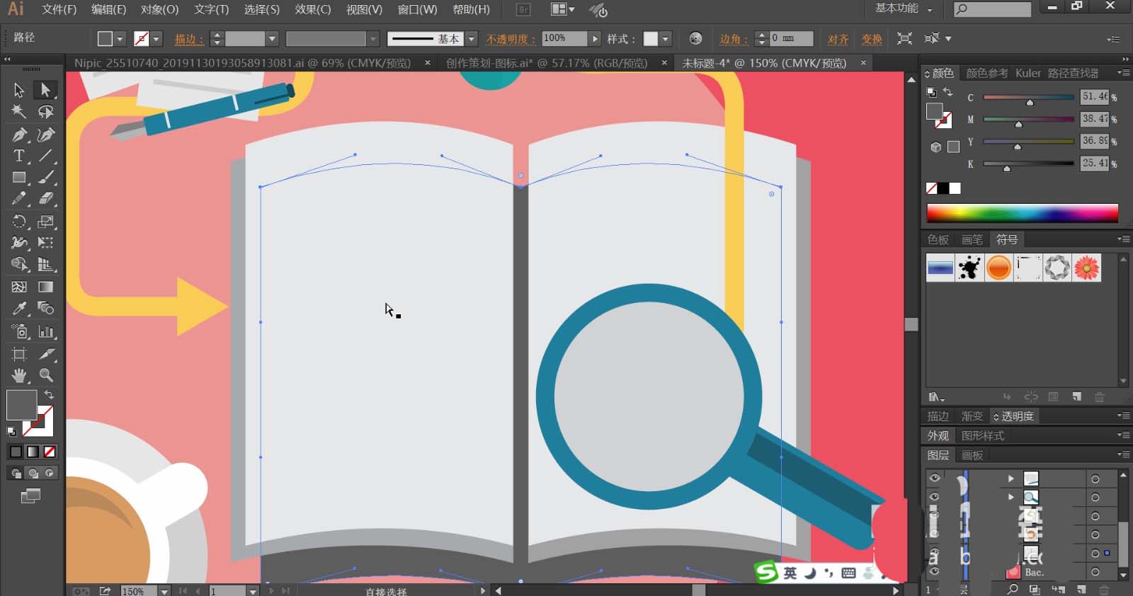 7、使用灰白色与灰黑色、黑色填充翻开的书本,再用蓝色与灰白色搭配填充放大镜的路径,导线使用橙黄色填充。
