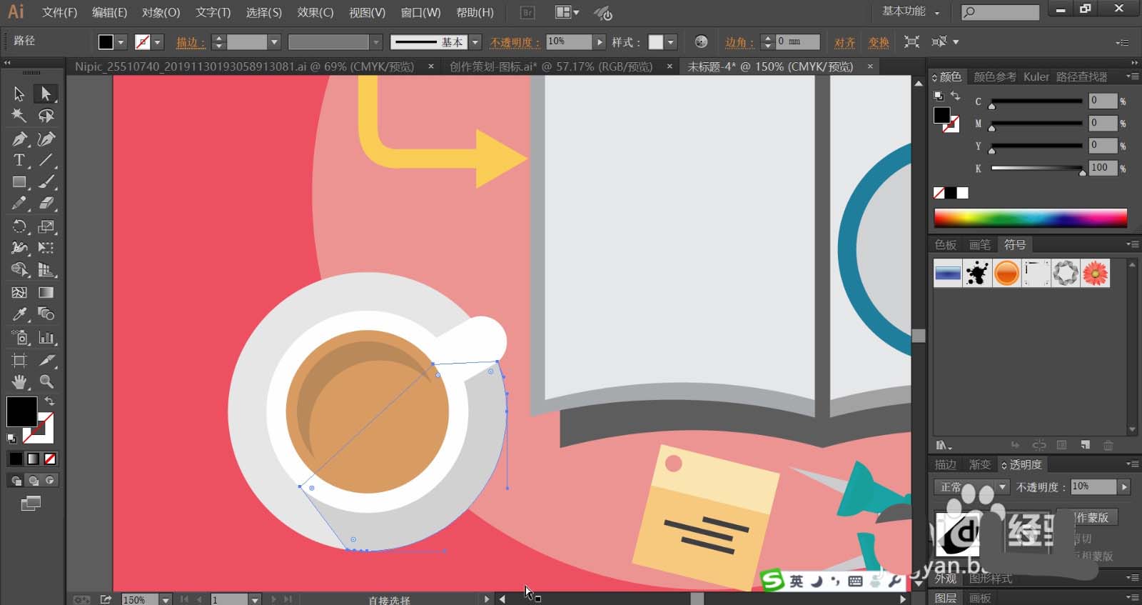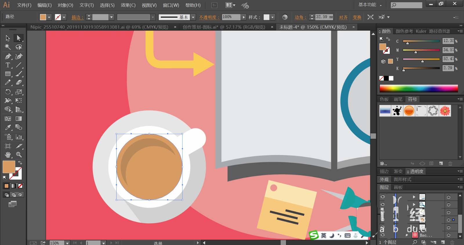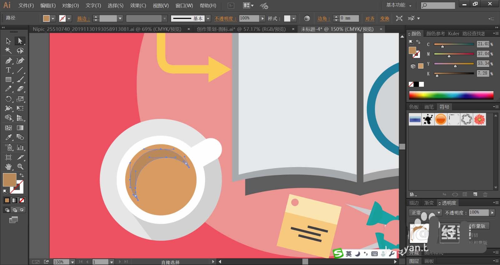 8、最后,我们使用灰白色与白色填充盆子与咖啡杯,再用黄棕色与灰棕色搭配填充咖啡,盆子上面的阴影使用透明度为20%左右的黑色填充,完成搜索研究图片设计。