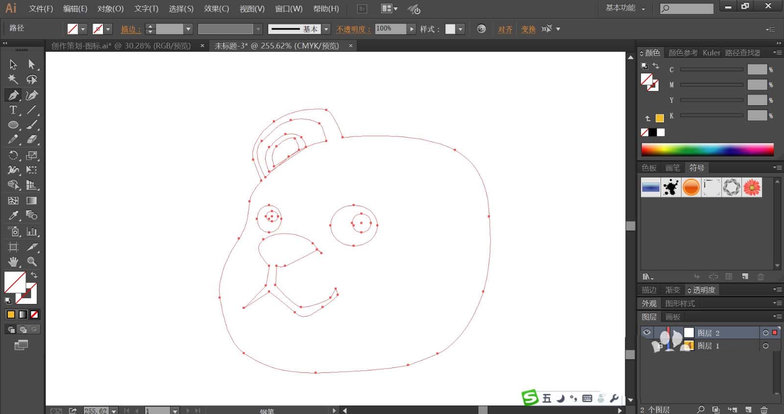 1、使用圆形画出小熊的眼晴细节,再用圆形画出小熊的耳朵与头部的轮廓路径。