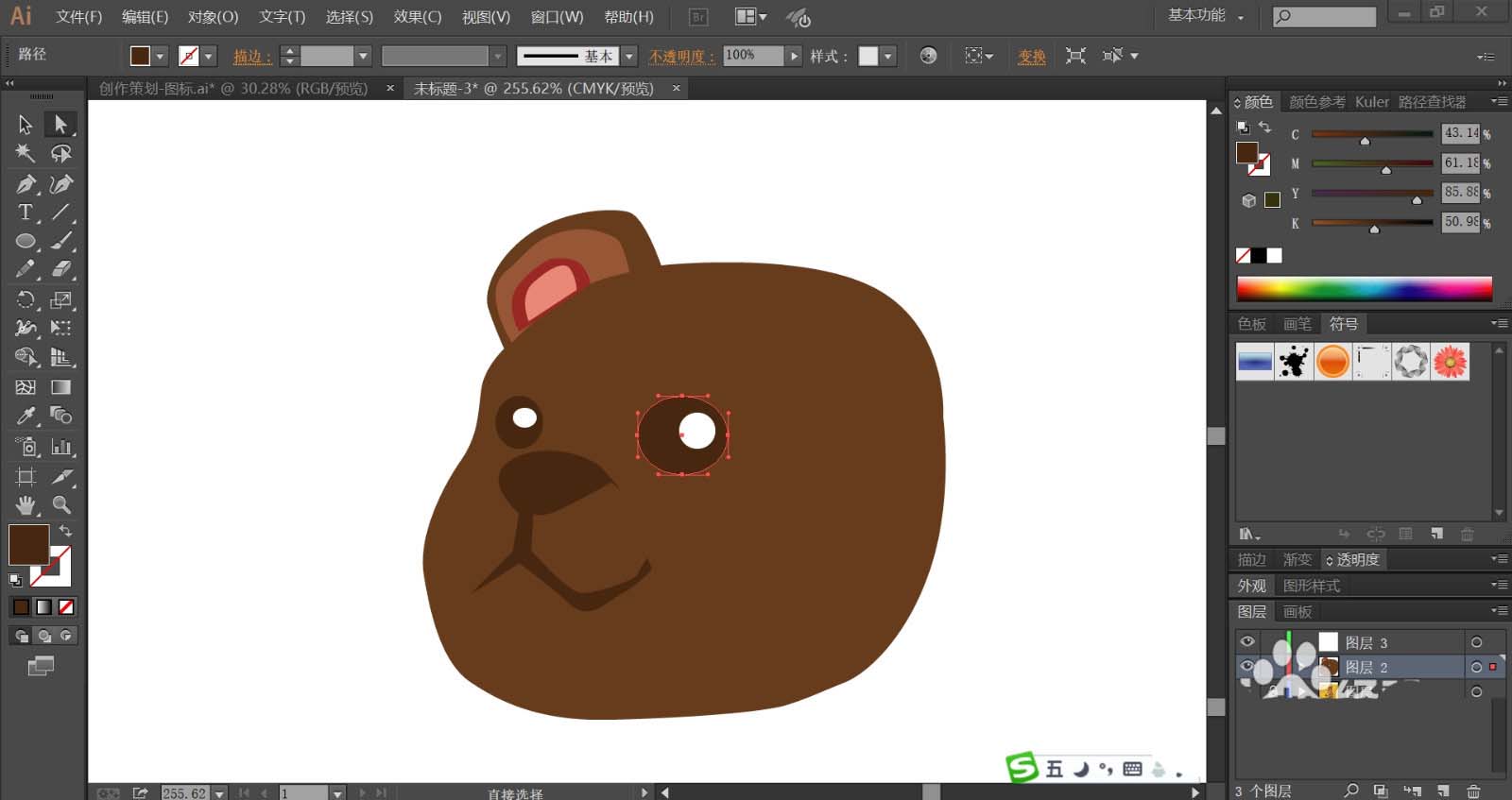 3、小熊的嘴巴与鼻子使用红棕色填充,嘴巴的外围区域使用暗粉色填充,头部右侧使用半透明的黑色填充呈现暗光边缘的效果。
