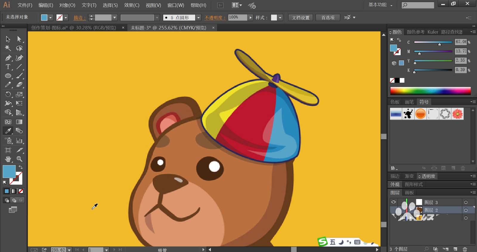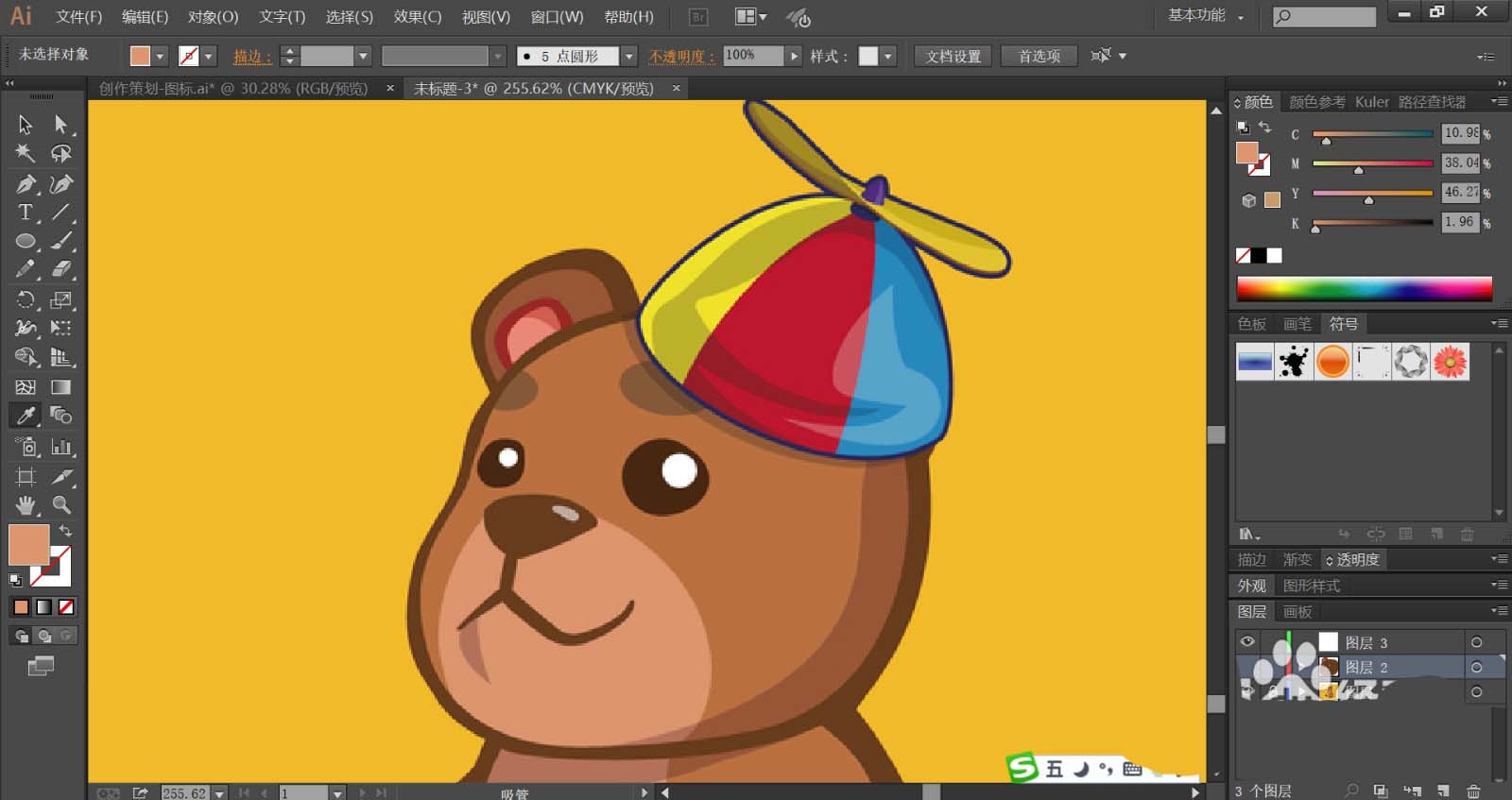 4、小熊的帽子用钢笔绘制出细节结构,再用黄红蓝三色搭配填充,再用半透明的黑色填充帽子上面的暗光,设置暗光为正片叠底模式,使用半透明的白色填充帽子右侧的高光。