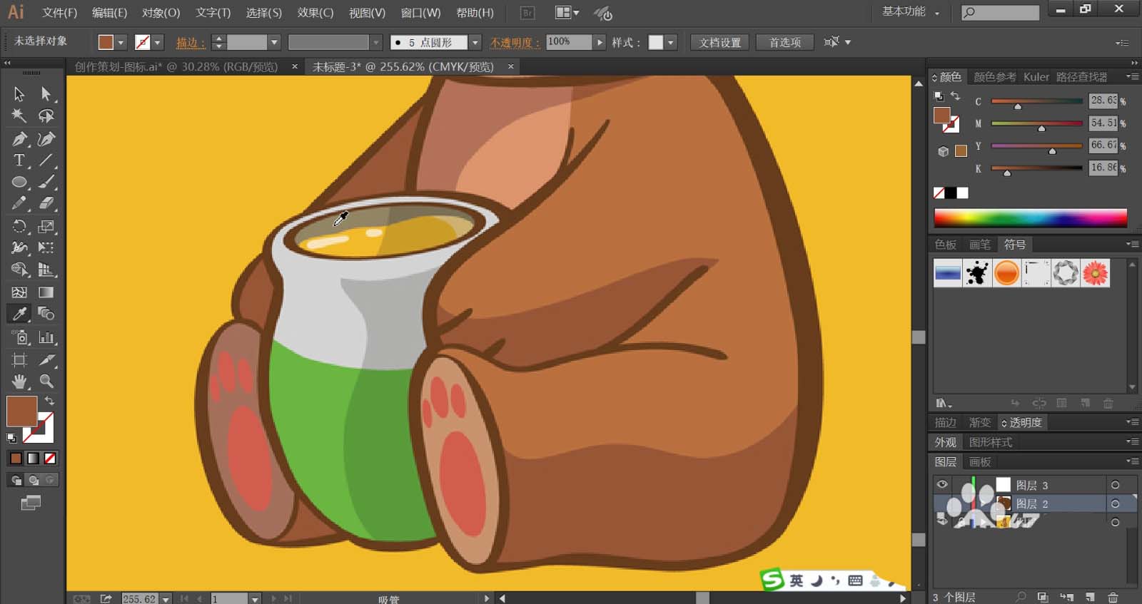 5、小熊的身体使用灰棕色与灰褐色搭配填充,在胸前的区域,我们使用暗粉色填充。胸前的左侧使用正片叠底的黑色填充出暗光效果。