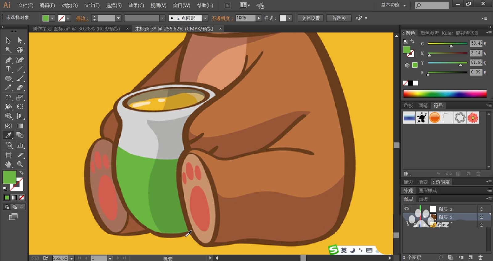 7、最后,我们用浅绿色与灰白色搭配填充盆子,再用橙黄色与黄色搭配填充盆子里面的汤汁路径,在盆子的右侧也做出暗光效果,完成贪吃熊形象设计。