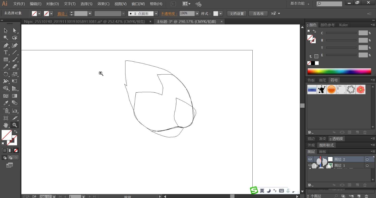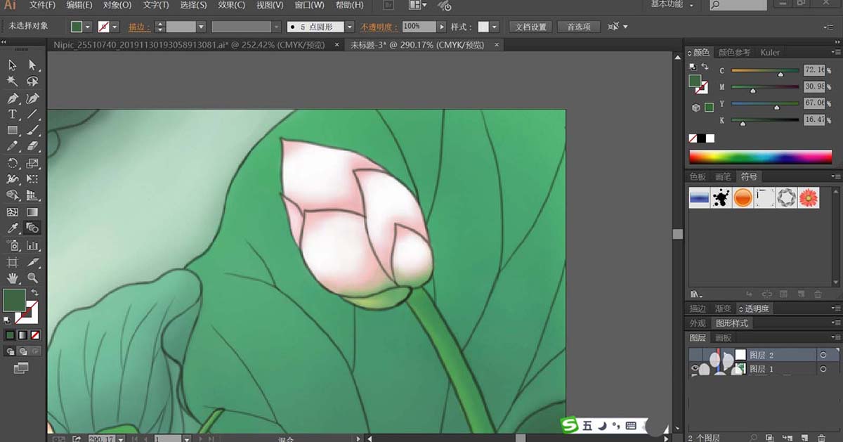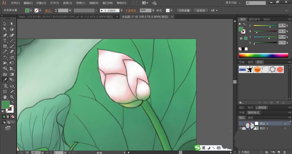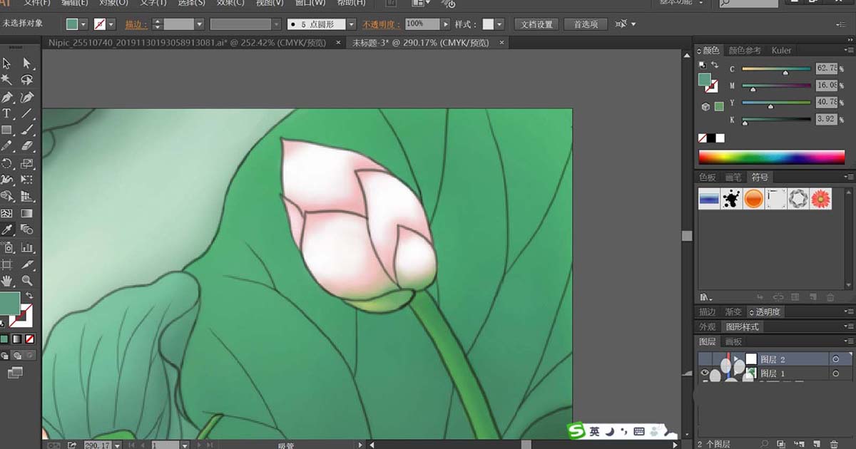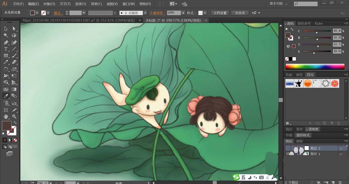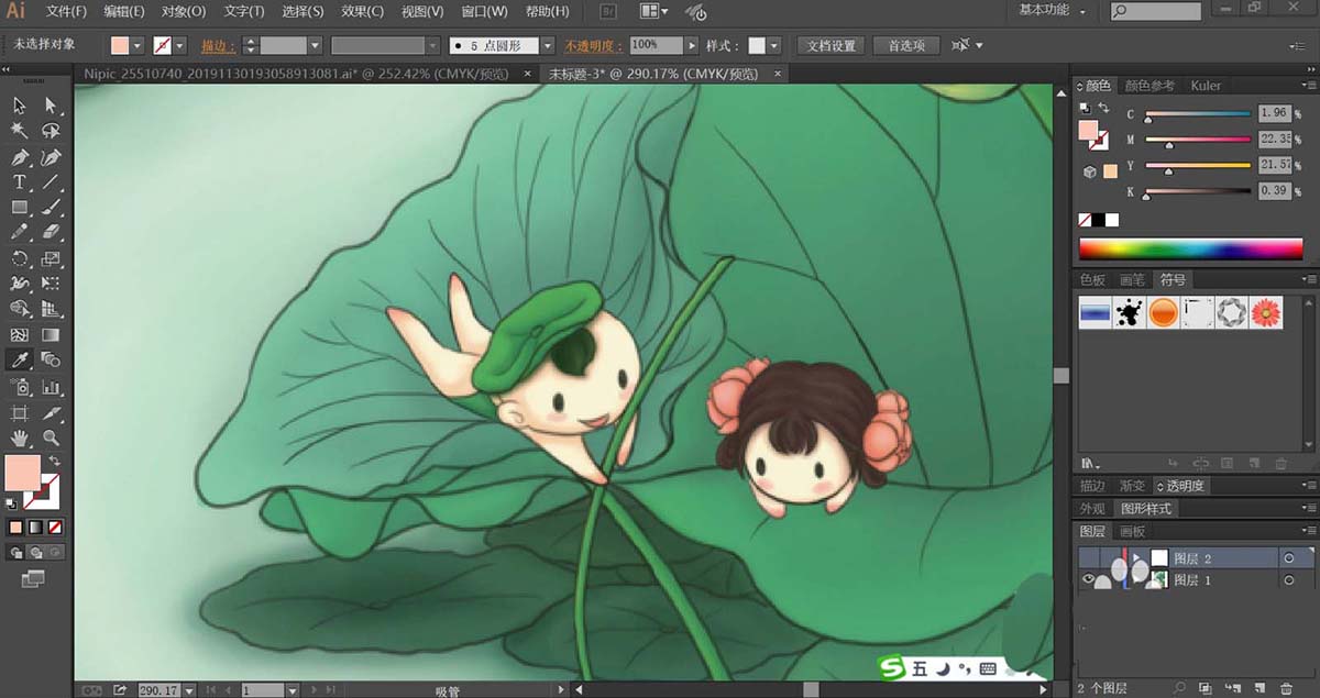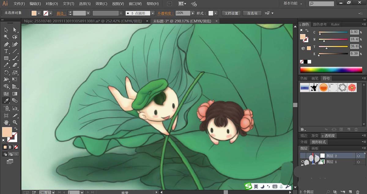 4、绘制出更多不同形状与绿色调的叶片,让其互相重叠在一起,再使用钢笔工具画出两个莲藕宝宝的基本轮廓路径,我们用粉红色与粉色搭配填充左侧的男宝宝,再用草绿色的渐变填充他的头发与头上的叶帽。