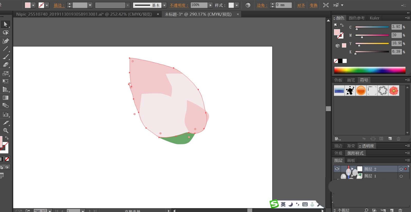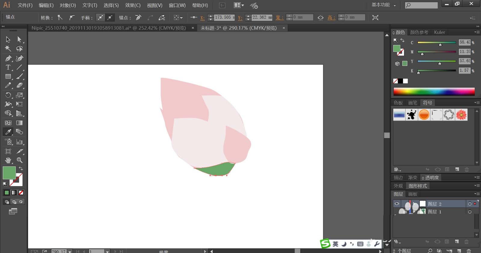 2、我们用粉红色与桃红色搭配填充花骨朵的上方结构,让其深浅色搭配呈现,再用绿色填充下方的小叶片。