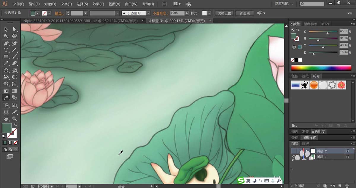 7、最后,我们用绿灰色到绿白色的渐变填充河流,在画面的左上侧画出更多的花朵与叶片,这里,我们用暗绿色的渐变填充叶片,使用暗粉色的渐变填充花朵,使用文字工具打上文字填充绿色,完成夏至荷塘素材。