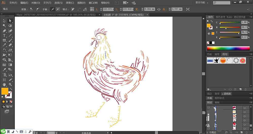 2、使用橙色、桔红色、暗红色、黄色分别填充公鸡身体表面的线条路径,通过过渡色让公鸡身体表面的色彩层次更加的丰富。