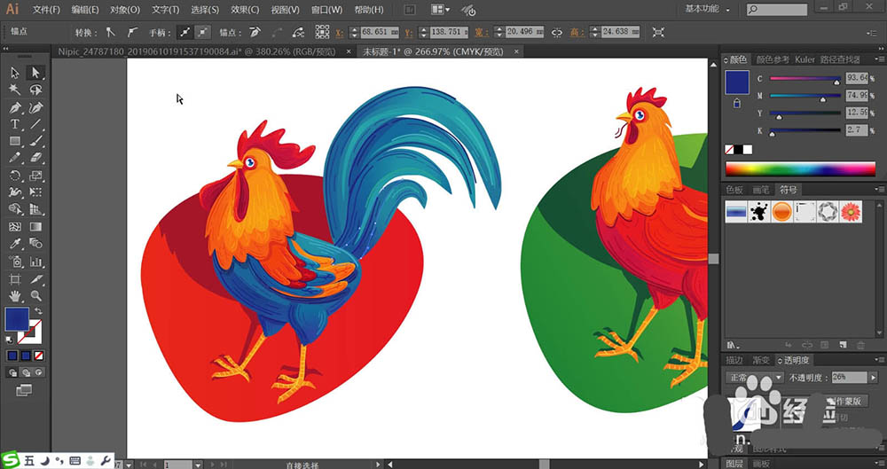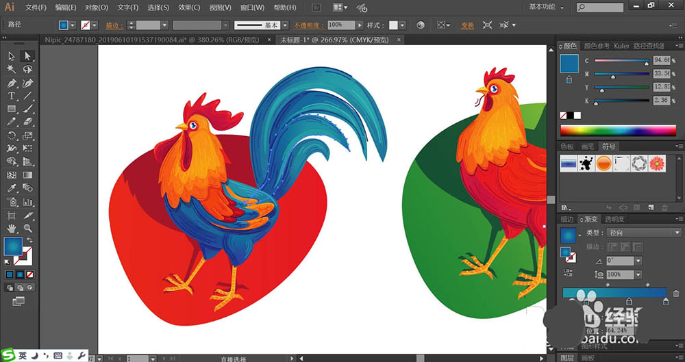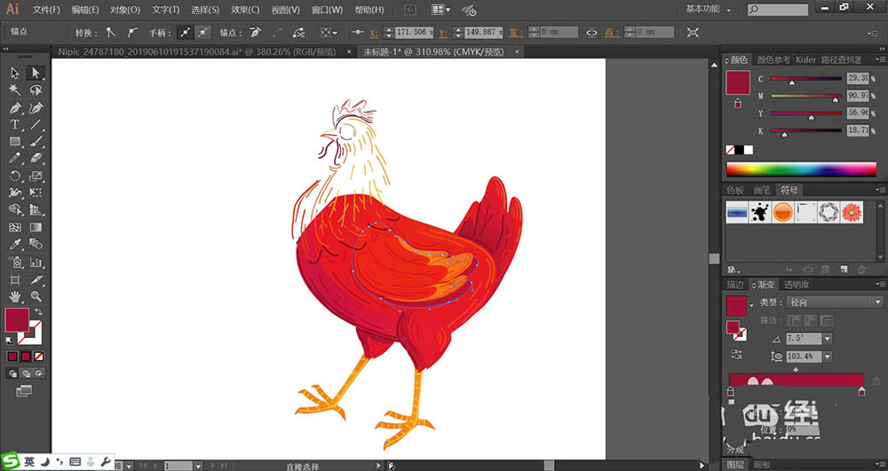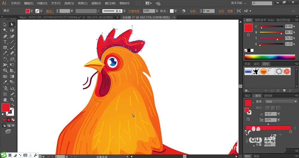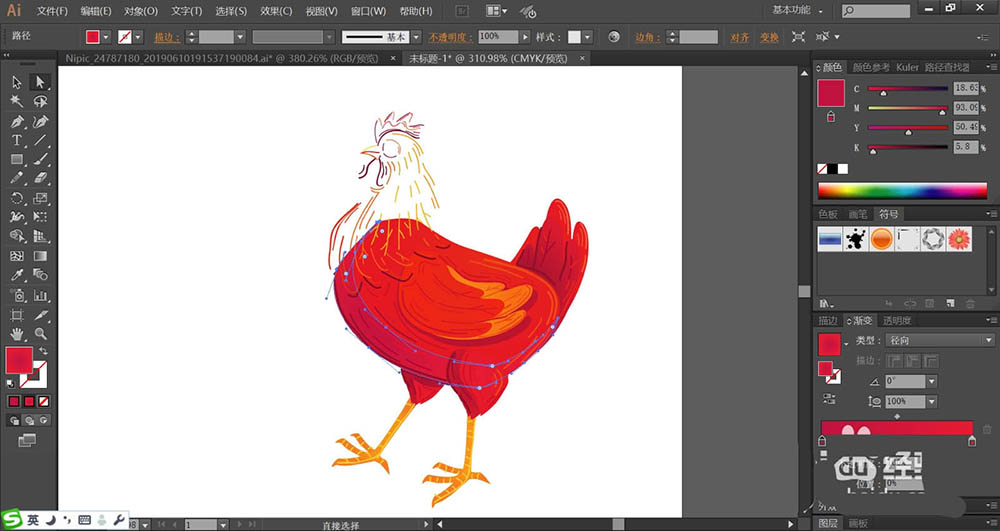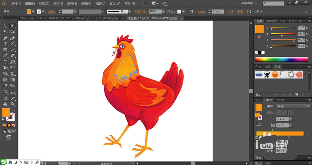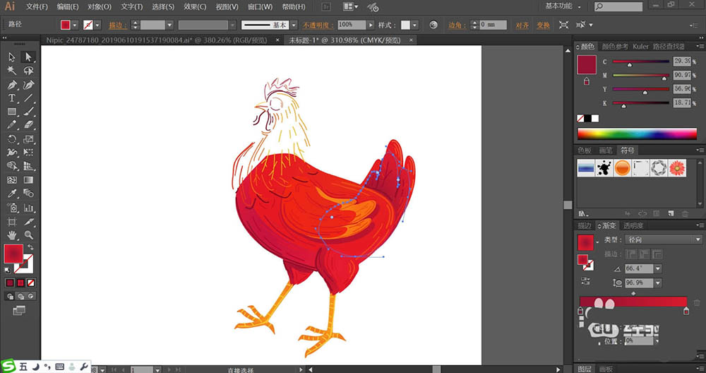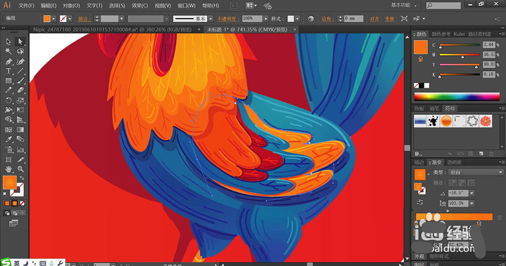 3、使用红色的渐变与紫红色的渐变搭配填充公鸡的翅膀与尾巴路径,再用橙色的渐变填充公鸡的双脚路径。