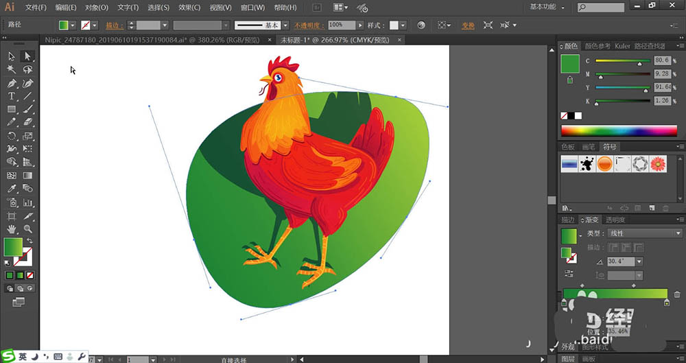 5、使用橙黄色的渐变与橙色的渐变搭配填充公鸡的脖子,使用红色的渐变与黄色线条搭配填充公鸡的鸡冠,使用明暗蓝色填充公鸡的眼晴,再用绿色的渐变填充公鸡所在的背景椭圆,影子使用半透明的暗绿色填充。