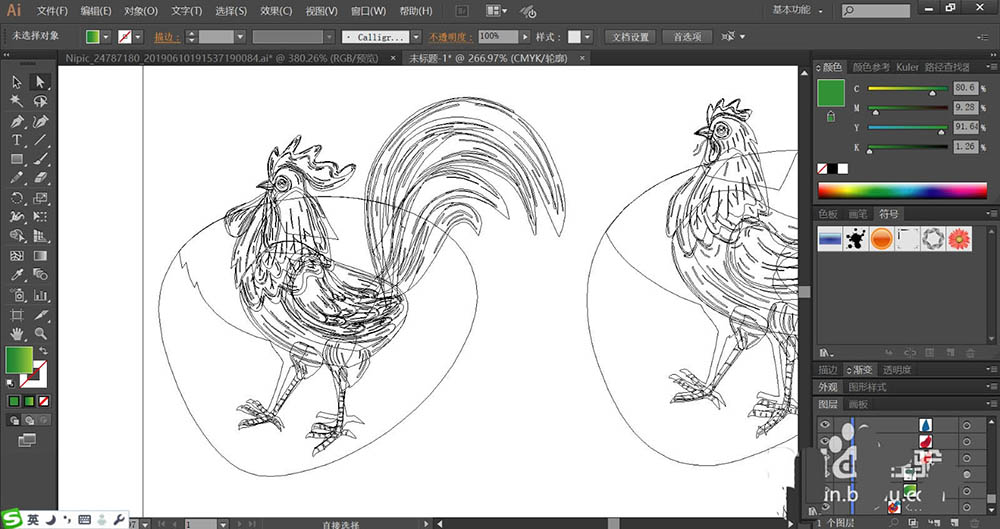 6、接着,我们用同样的方法画出左侧有着大尾巴的公鸡的身体细节路径,重点绘制尾巴上面的不同位置的羽毛路径,包括明暗光线的路径。