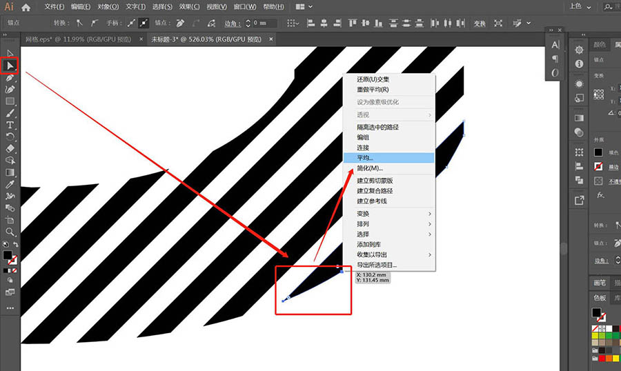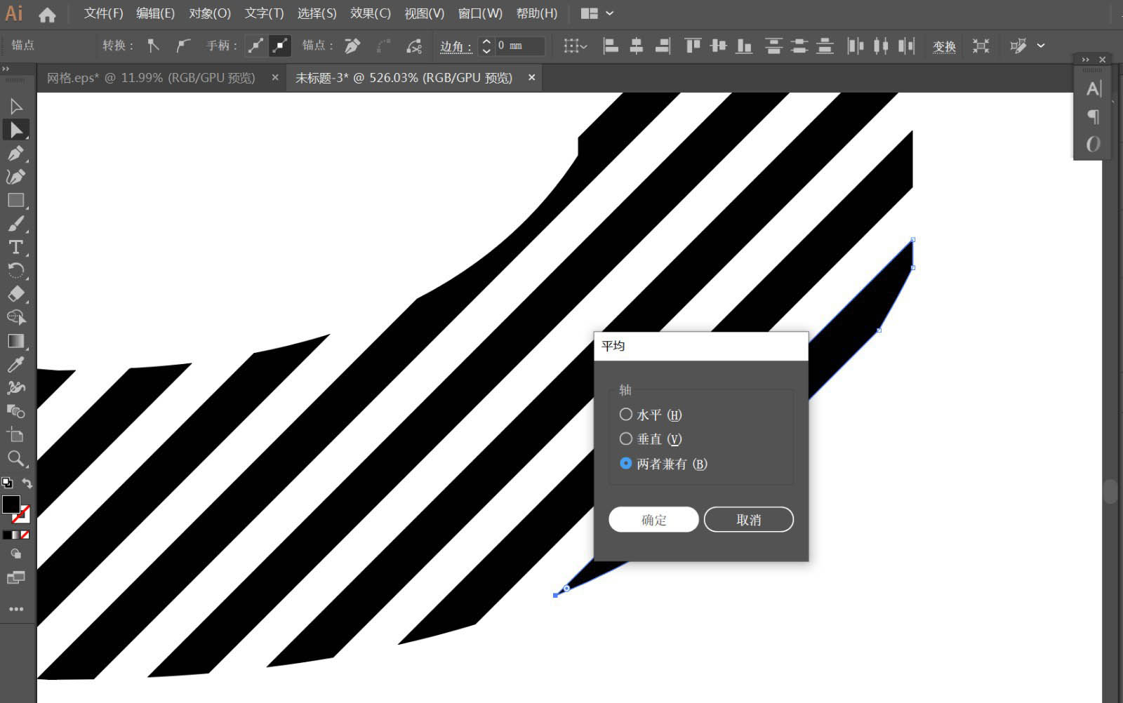 7、切换为节点工具,将每条直线下边的2个点选中,右键,平均,勾选两者兼有,确定,其他矩形同样的方法处理如图