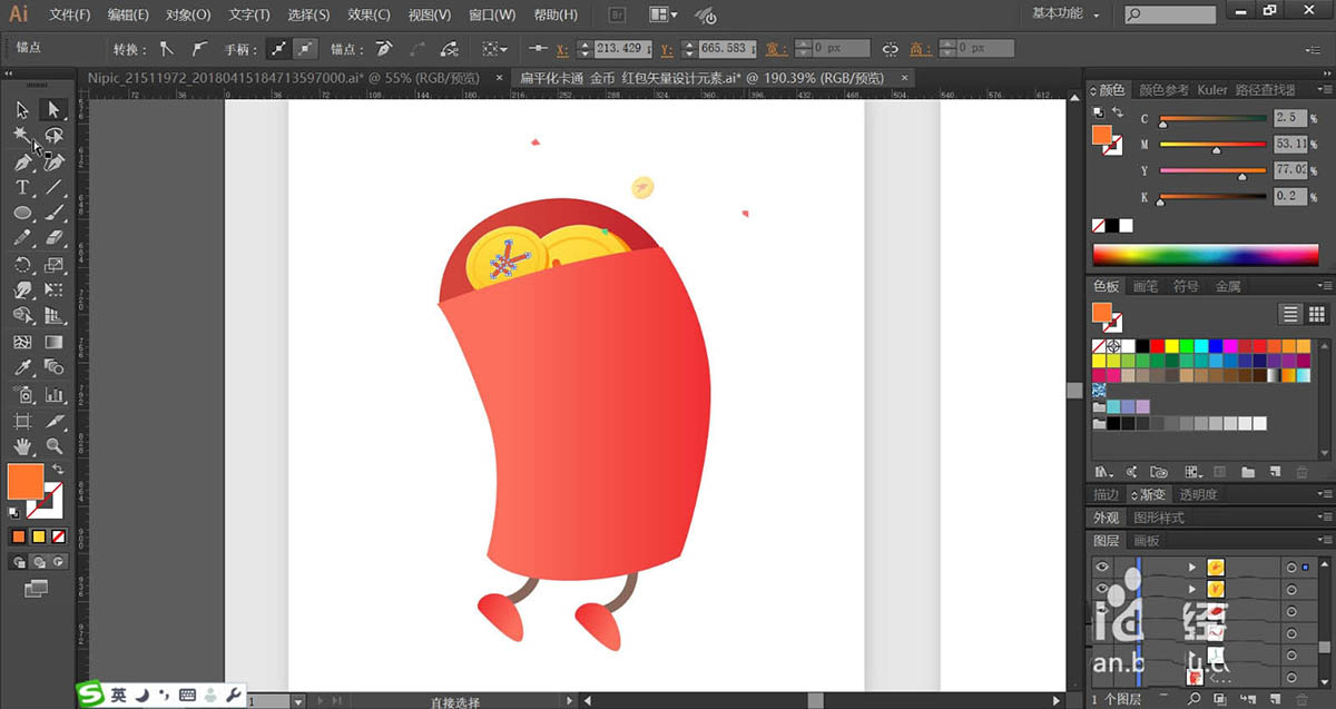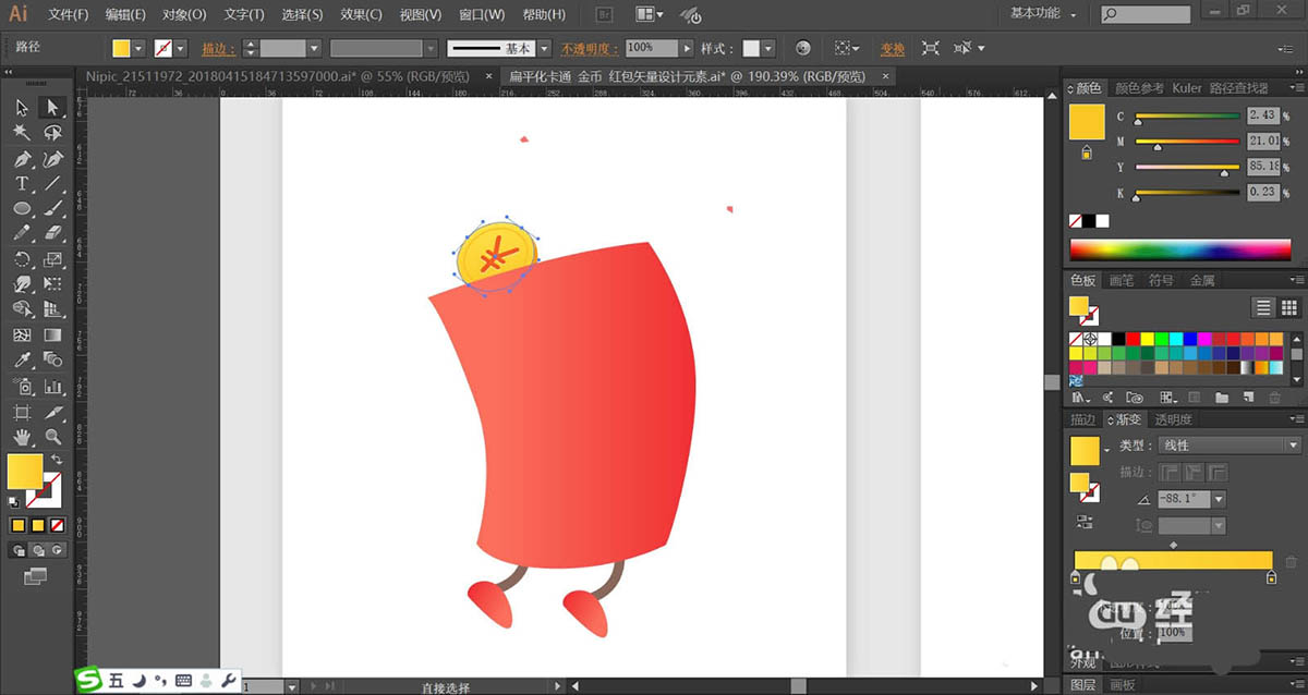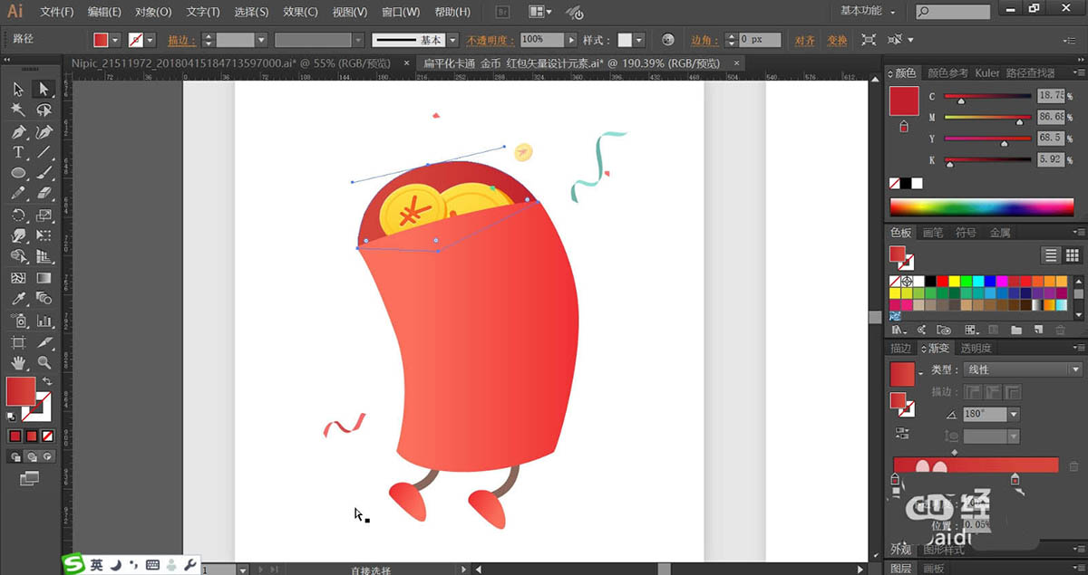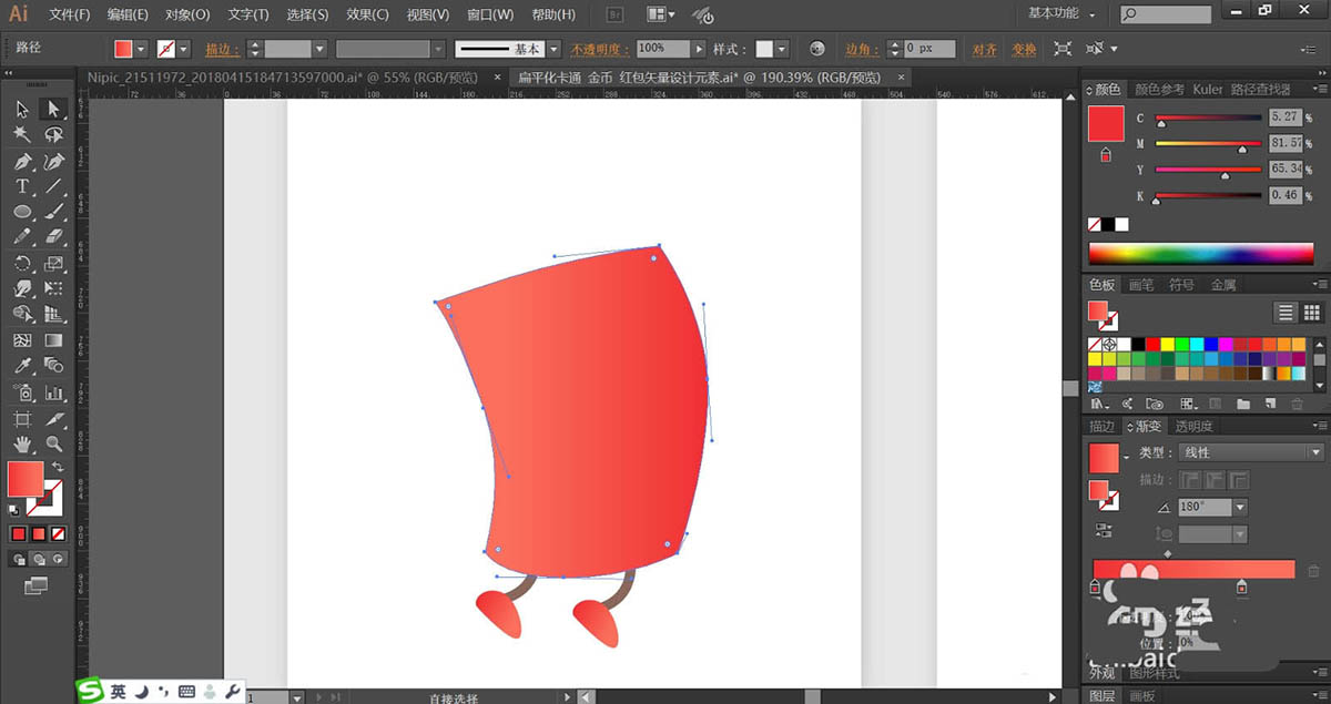 2、使用海棠红色的渐变填充红包的身体与双脚,再用灰褐色填充红包的双腿路径。