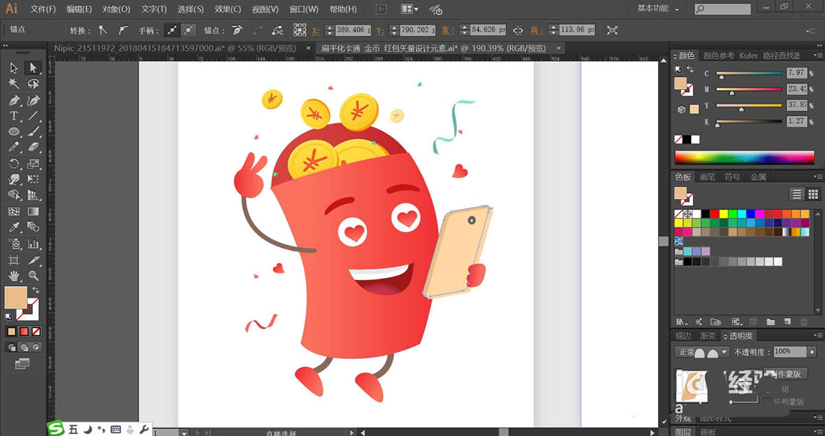7、最后,我们画出红包的左手与右手的细节路径,并用海棠红色的渐变填充,画出右手的手机轮廓,使用明暗不同的米黄色填充,画出心形图案在眼晴中并填色,完成红包形象设计。