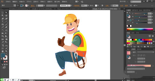 继续使用钢笔画出左侧站立的电工形象路径,我们用之前的方法对于左侧的电工填色,再用灰色与咖啡色填充左侧电工身上的绳索与金属扣。电工手里的绳索使用白色填充。