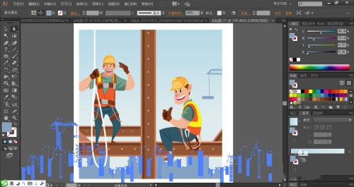 最后,我们用天蓝色的渐变填充天空,再用蓝黑色填充远处的吊机,与城市的建筑群体,再用矩形裁剪所有的元素让其成为一个矩形的画面,完成电工形象设计。