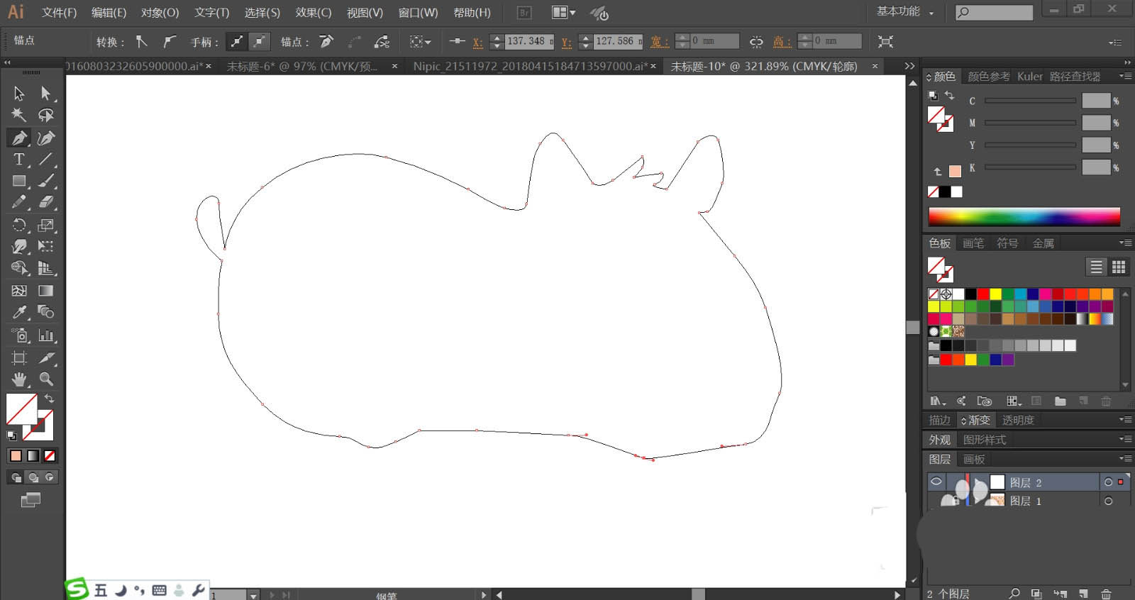 1、使用钢笔画出睡觉仓鼠的基本身体轮廓,重点是绘制它的尾巴与耳朵的内外细节路径,再画出仓鼠的眼晴与嘴巴的细节,身体上面的不同毛发色彩区域也用路径呈现出来。