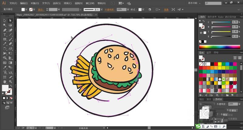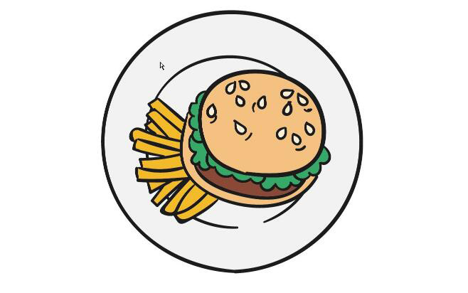 使用圆形工具画出餐盘,再用钢笔画出汉堡、菜叶、薯条的细节路径,勾勒出汉堡上面的芝麻粒的细节路径。