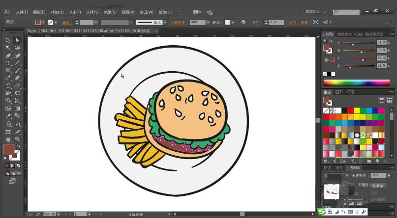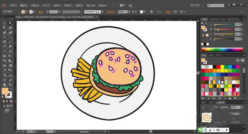 使用灰白色填充餐盘的路径,再用黄粉色填充汉堡,芝麻使用灰白色填充。