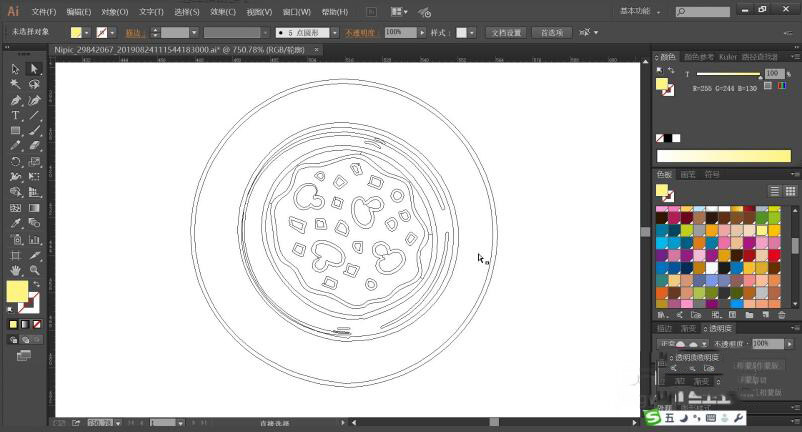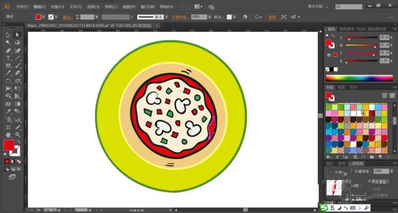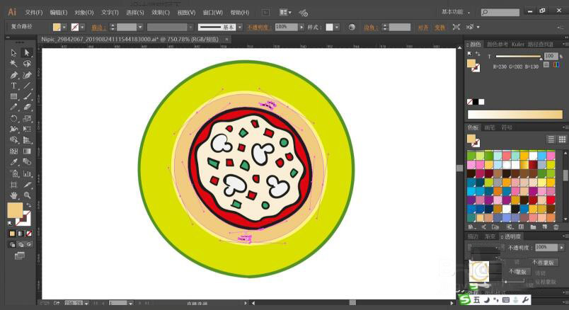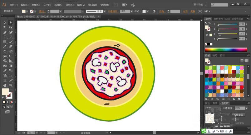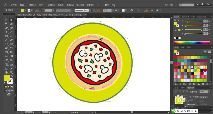 接着,我们使用圆形工具画出餐盘的轮廓路径,再画出披萨的圆形轮廓,包括内圆与外圆边的路径,使用钢笔勾勒出披萨上面的各种零散美食元素的路径。