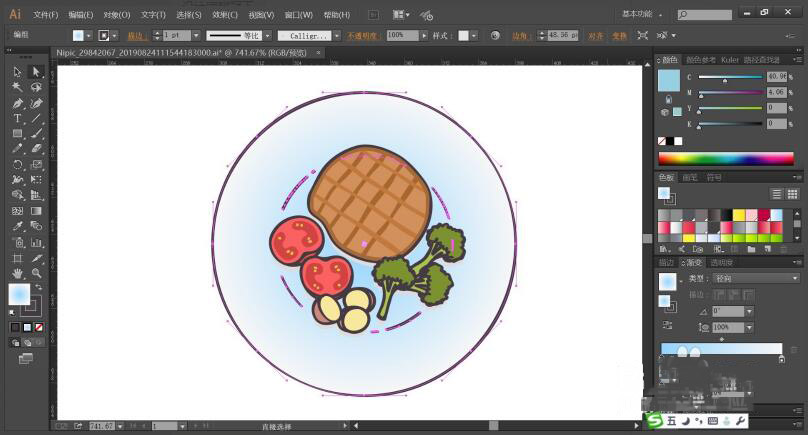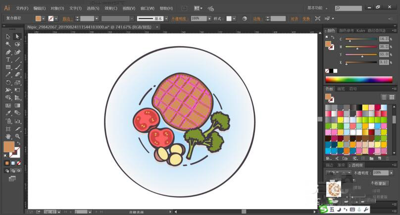 最后,我们画一画牛排的美食图片,使用圆形画出餐盘并用天蓝色的渐变填充,再用钢笔勾勒出牛排的路径,我们使用明暗不同的棕色填充,使用红色与黄色搭配填充小番茄的路径,使用绿色填充菜叶的路径,再用土黄色与黄褐色填充蔬菜颗粒,完成牛排图片设计。