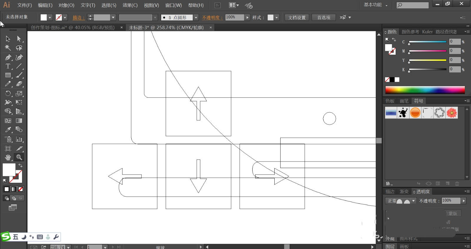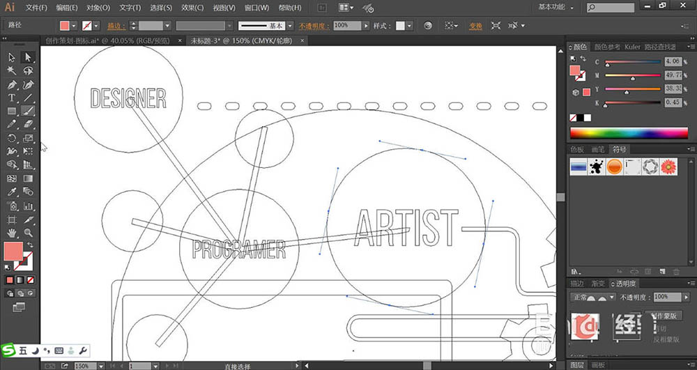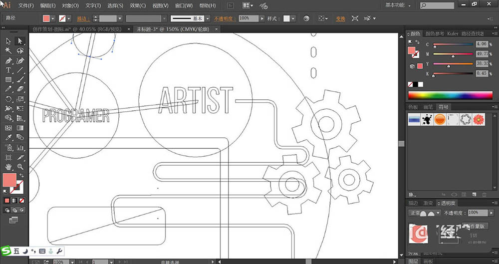 3、继续绘制出曲线与圆角矩形作为流程图的补充,再用钢笔画出大小不同的齿轮路径。