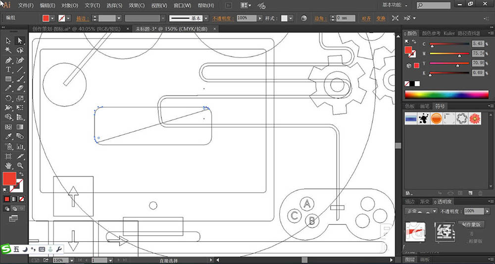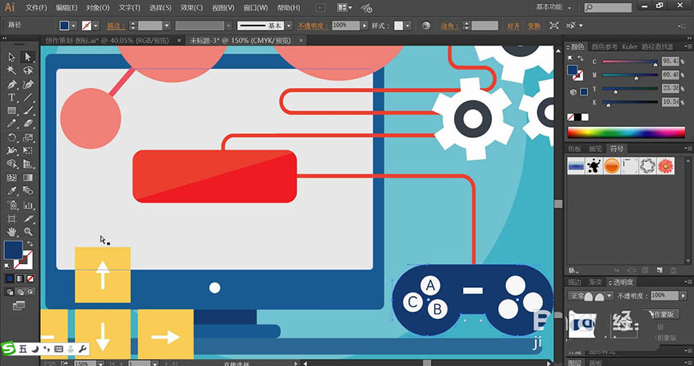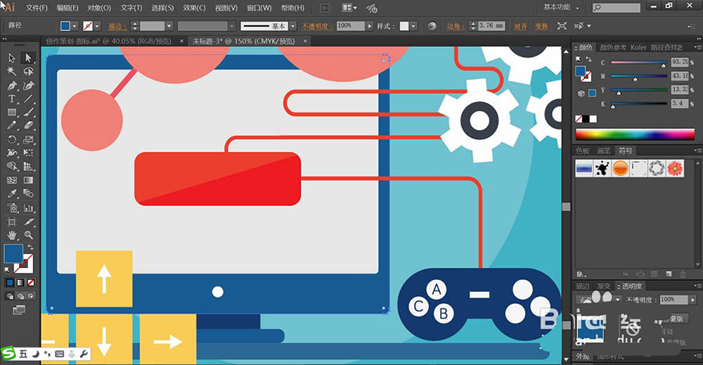 5、这一步,我们用矩形与钢笔画出显示器的路径,重点绘制显示器的边框与内部,还有显示器的支架路径,再画出游戏手柄的细节路径。