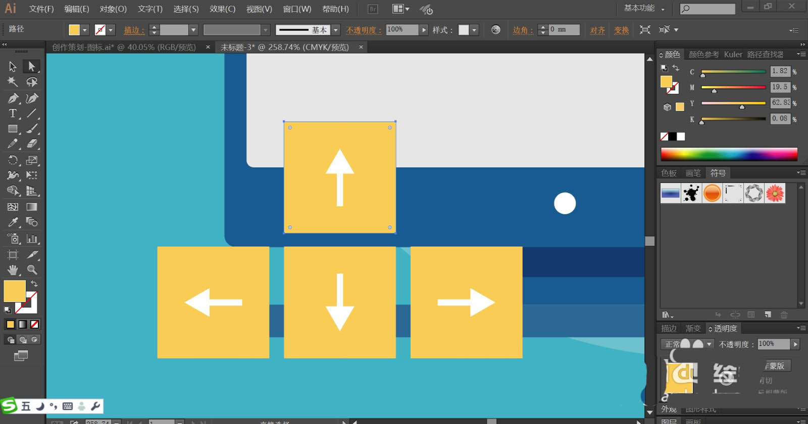 1、使用矩形工具与钢笔画出游戏中常常使用的方向键的基本轮廓,再用橙黄色与白色分别填充正方形与箭头的路径。