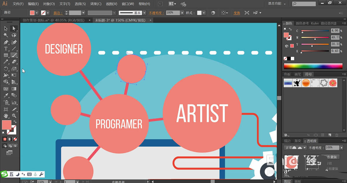 2、使用圆形工具与钢笔画出代表流程的圆形与连接线的路径,再用红灰色填充圆形,红色填充连接线,文字使用白色填充。