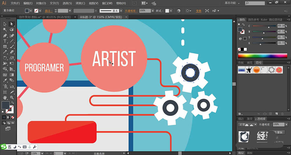 4、我们用红色填充连接线与圆角矩形,再用蓝黑色与白色搭配填充齿轮的外部与内部的路径。
