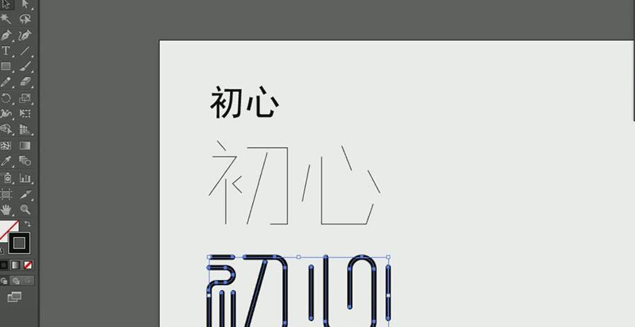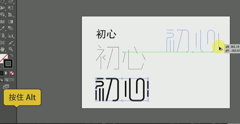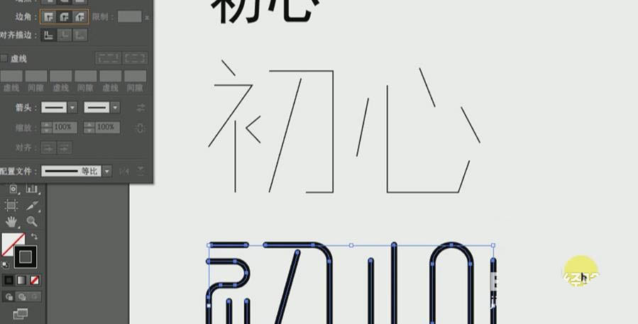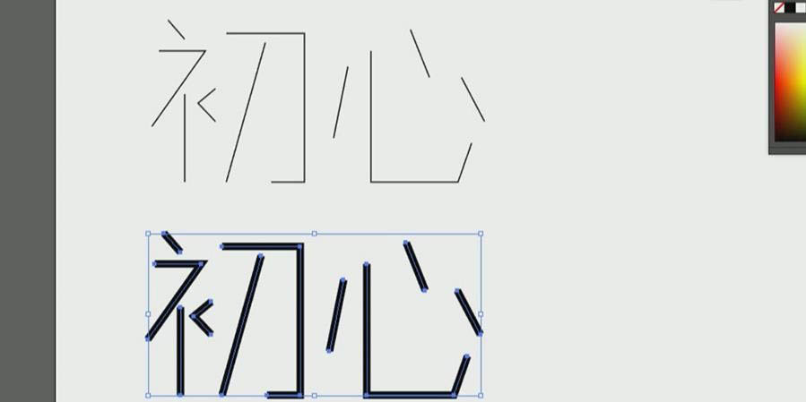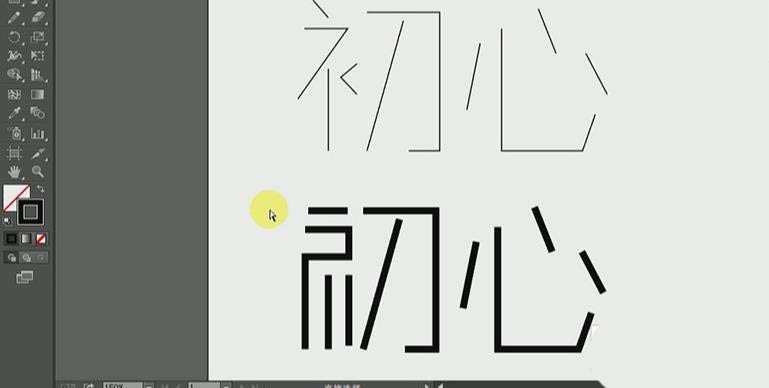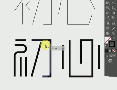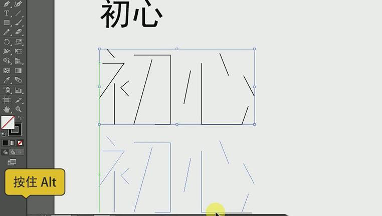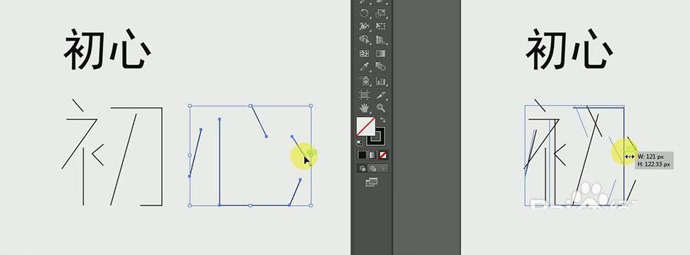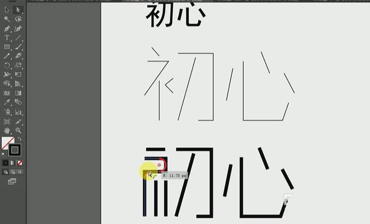 8、同样的操作先删除【心】部分笔画,再用【钢笔工具】勾画出新的,选中【心】整体,移动到【初】调整一样的大小即可。