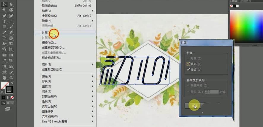14、把调整好的文字,拖入准备好的背景里,选中文字菜单栏--【对象】--【扩展】,勾选【填充】和【描边】再确定。