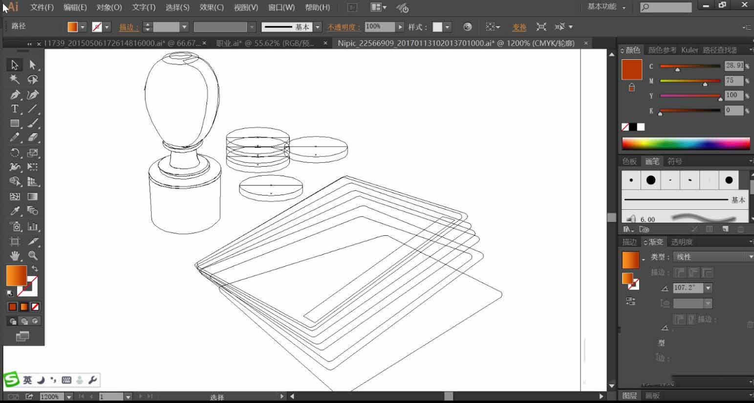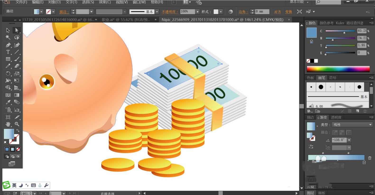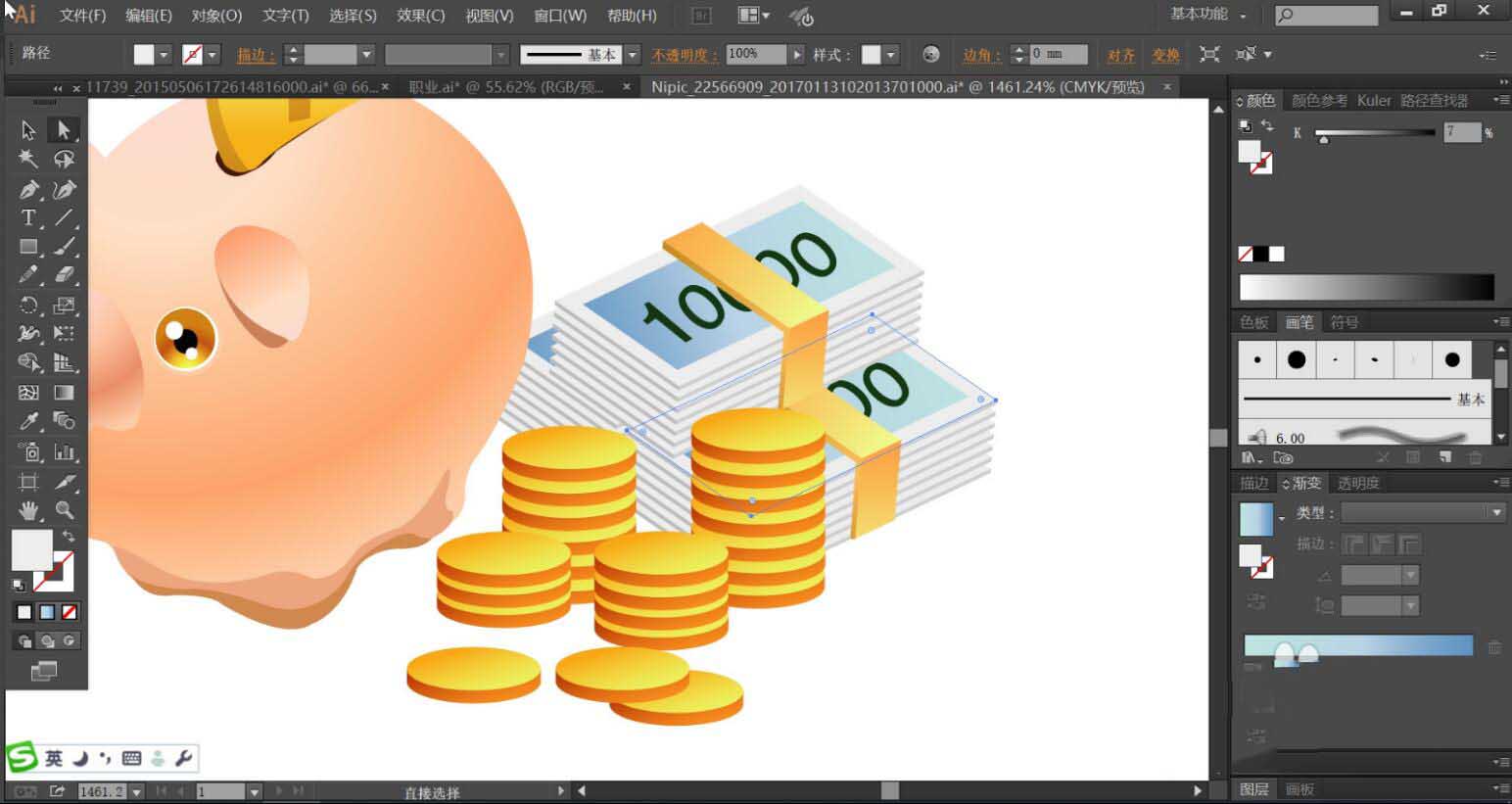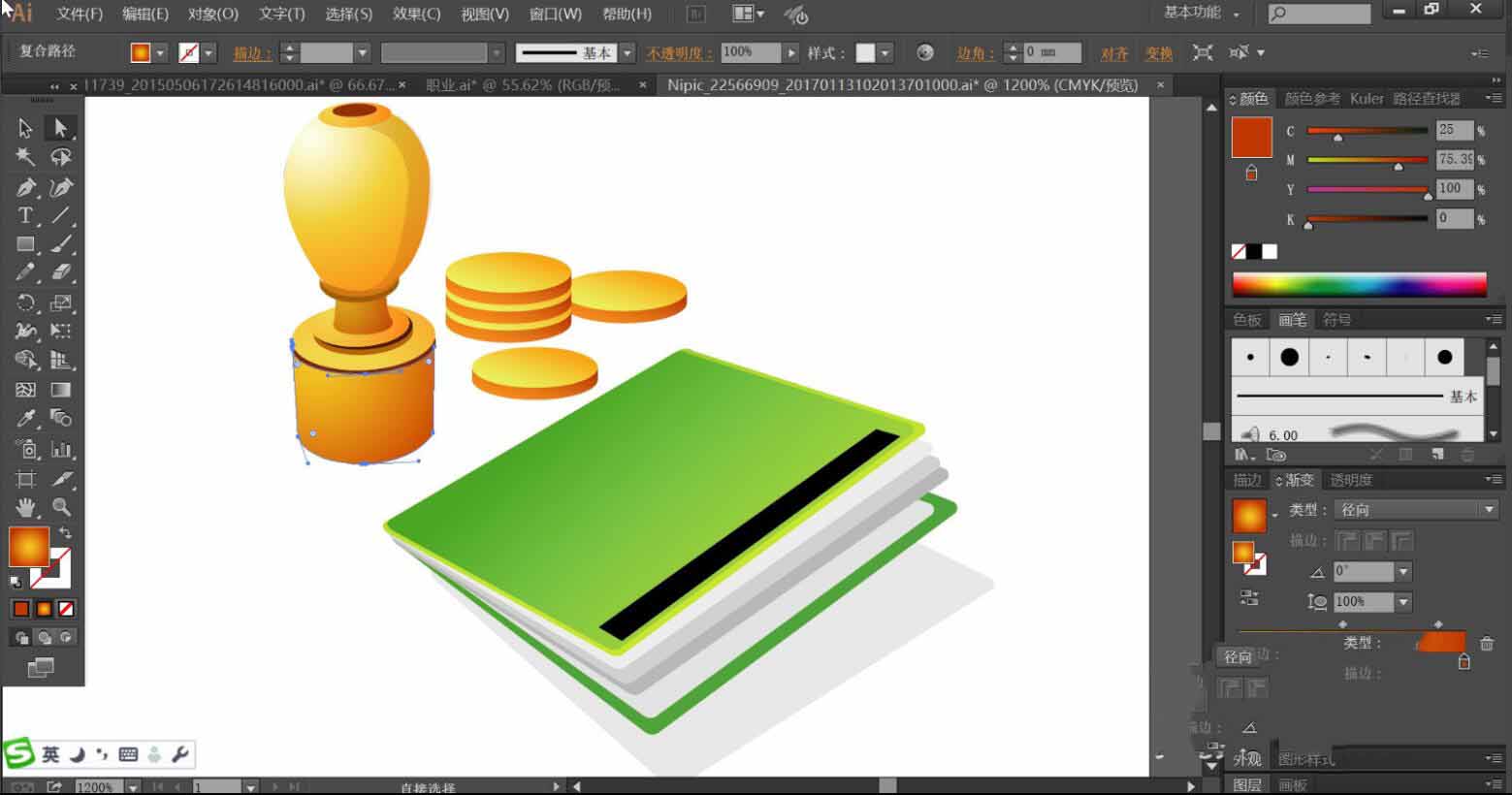 最后,我们使用钢笔画出印章与折子的路径,再用圆形画出散落的圆蹦。使用金黄色的渐变填充印,再用浅色与暗色来制作明暗效果,再用绿色的渐变与黑色与灰色搭配填充折子,完成钱罐插画设计。