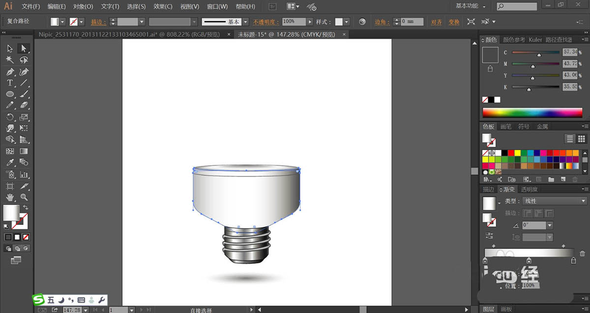 1、使用钢笔画出灯泡的底座与上面的结构细节路径,再用线条工具画出灯泡底座上面的横条形状。使用网格工具点击灯泡底座上面的螺纹路径让其成为渐变色效果。