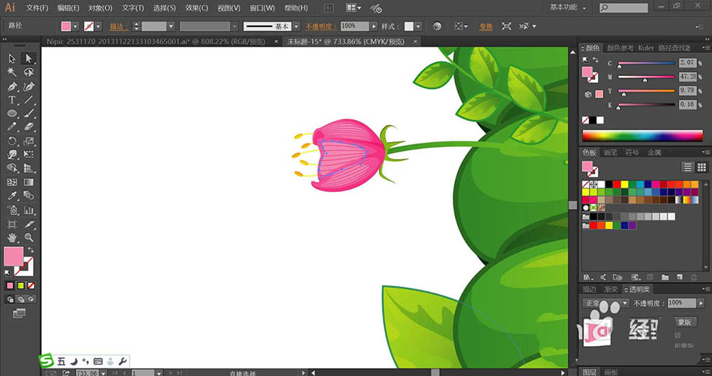 6、这一步,我们用明暗品红色填充花朵的花瓣,再用橙黄色填充花朵左侧的花蕊路径。