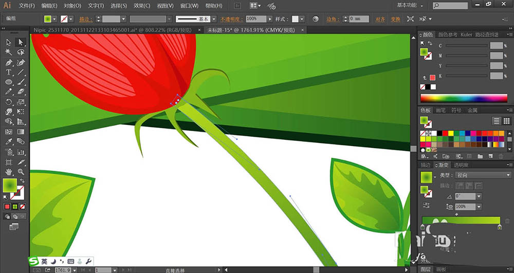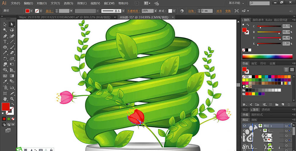 7、最后,我们复制更多的叶片到枝条的更多位置,再用明暗不同的红色填充正面的花朵,使用嫩绿色的渐变填充树条,完成灯泡创意图设计。