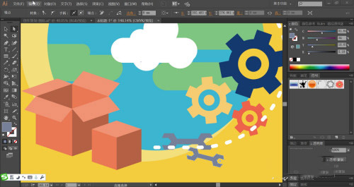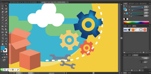 最后,我们用橙黄色、红色、深蓝黑色填充齿轮的路径,再用明暗橙黄色填充背景与地球的影子,打上文字并填充白色,完成全球服务插画设计。