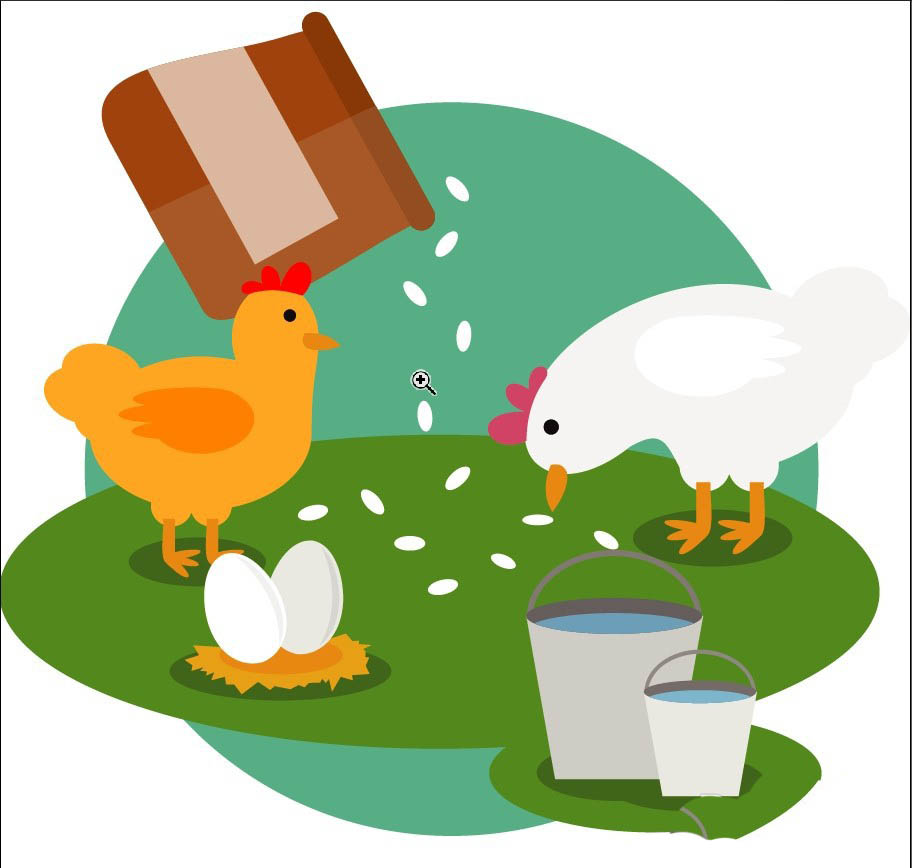 8、最后,我们用圆形画出两只蛋,再画出鸡蛋右上侧的暗光路径,我们使用灰白色填充鸡蛋,使用暗灰色填充鸡蛋右上侧的暗光路径,使用橙黄色与桔黄色分别填充鸡蛋底部的草垫,完成喂鸡插画设计。