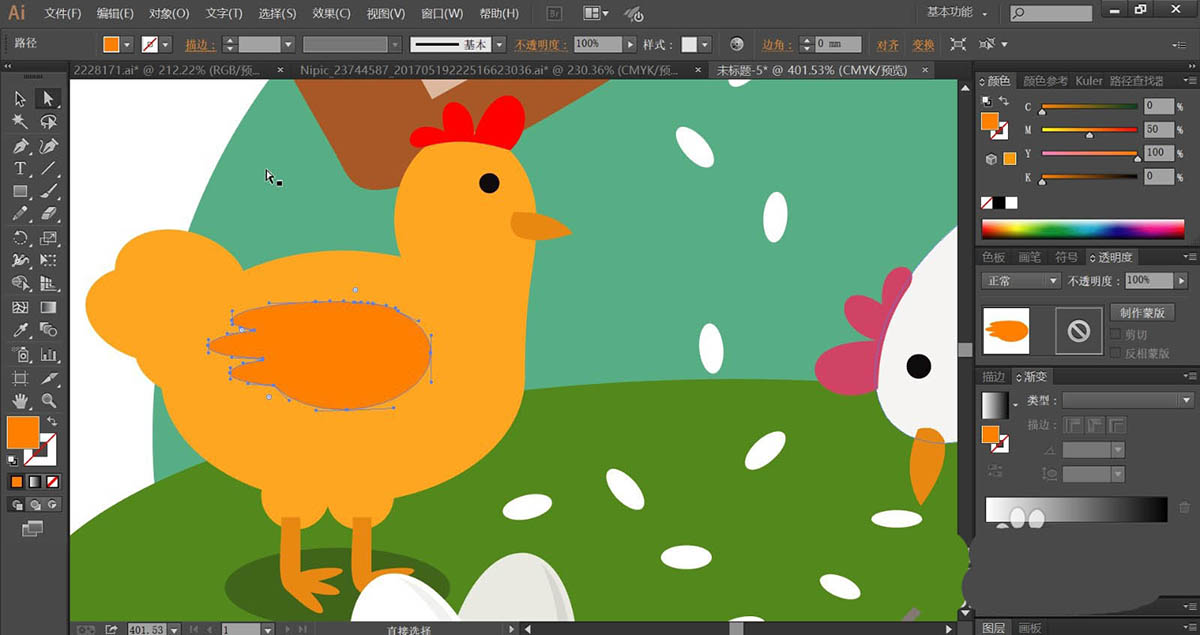 4、使用橙黄色与橙红色搭配填充母鸡的身体路径,再用红色填充鸡冠,使用暗橙色填充鸡嘴与鸡脚,使用灰白色填充米粒的路径。