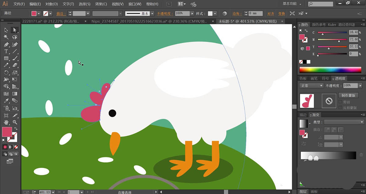 5、使用灰白色与灰色搭配填充右侧的母鸡身体轮廓,使用品红色填充鸡冠的路径,使用黑色与橙黄色分别填充鸡的眼晴与脚。