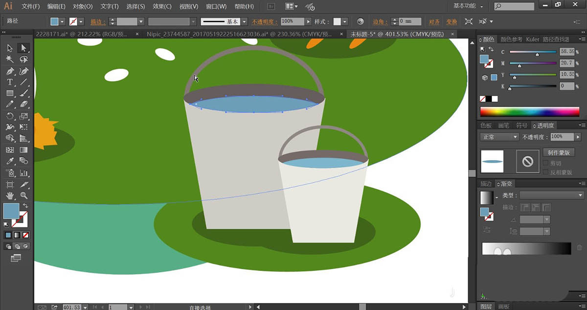 6、使用钢笔画出大小两个水桶的细节路径,重点绘制水桶内的水与外面的手柄路径。