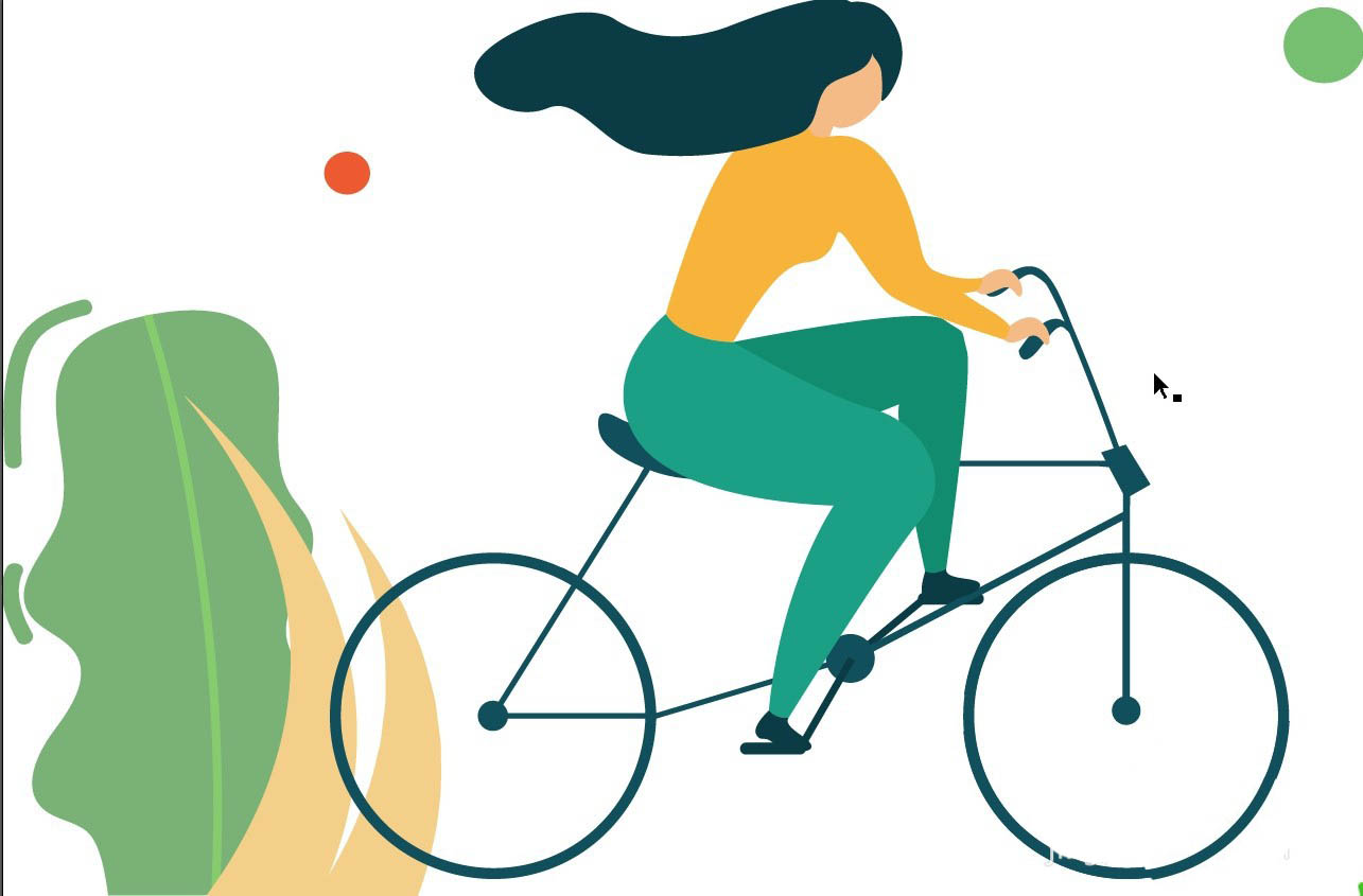 3、女子脸部与手臂的皮肤使用黄粉色填充,左侧的植物使用绿灰色填充,地面使用黄灰色填充,完成女子骑车插画设计。