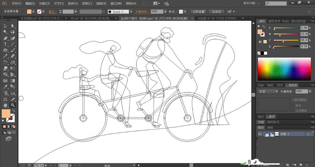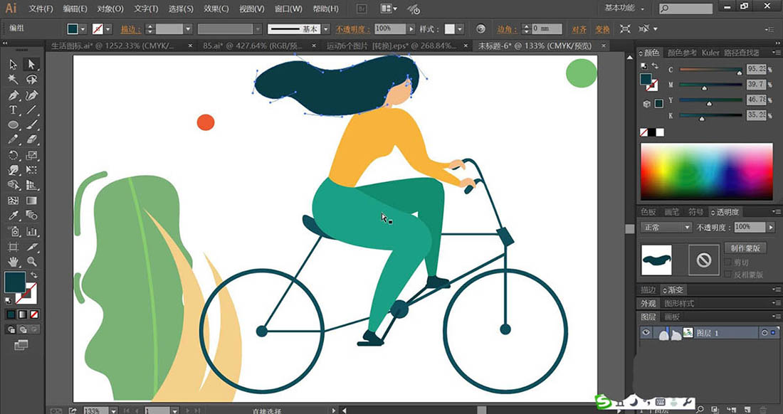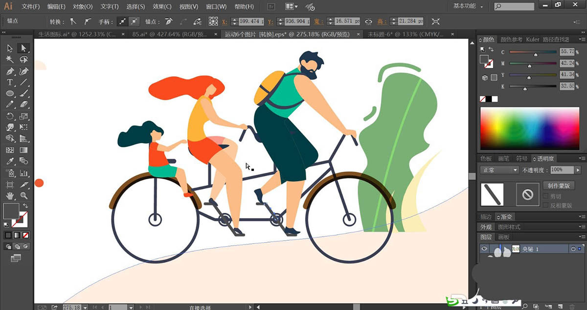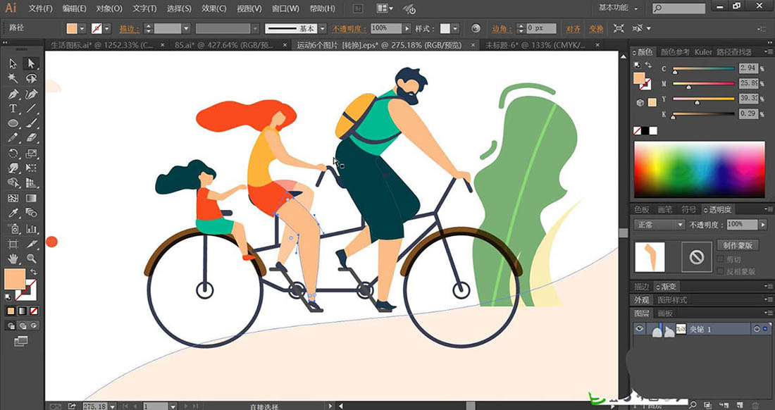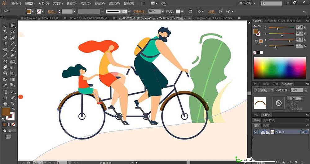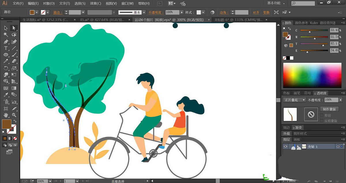 7、有了前面的技巧,我们再来绘制二人自行车插画,使用钢笔画出小树的叶片与枝干,再画出自行车的结构与车上面的二人的身体动作轮廓路径,使用明暗青色填充小树的叶片,使用暗茶色填充树干,使用青色与橙色,橙色与红色分别填充男子与小孩的服饰路径,自行车使用灰褐色填充,完成自行车运动插画设计。