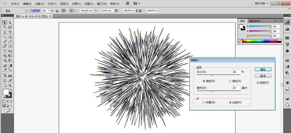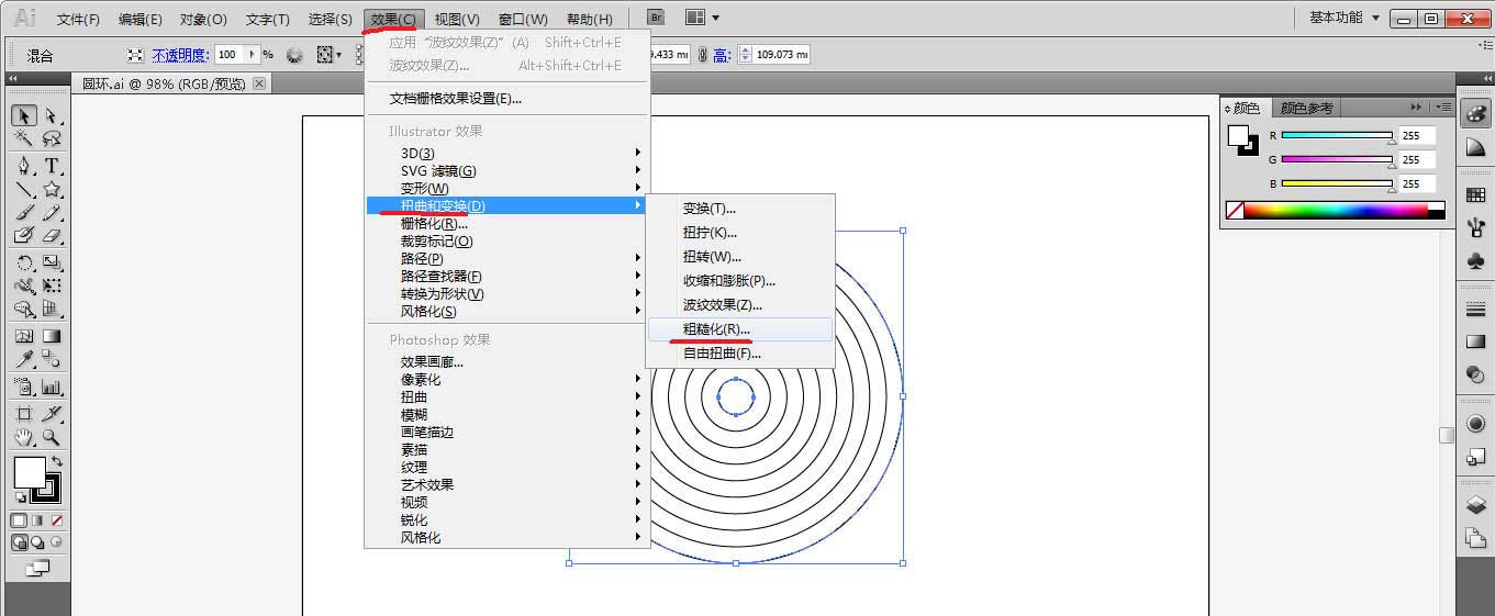 4、选择圆环,点击效果-扭曲和变换-粗超化,预览设置效果